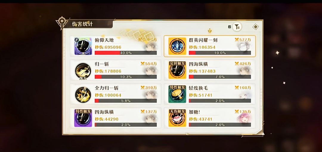 以下内容,都是我自己测试自己的号,有不同的理解,就按你们自己的来就行了 木桩伤害最高的连携,就是主角暴击触发挂件,因为他快 打15层,或者白日 伤害最高的连携是1暴击触发2,2暴击触发3,没有暴击就选命中(命中3个的不算) 打白日,除了云之梦,其他的连携,和攻击特性触发的占比差不多,所以装备普攻的收益也很高 装备词条: 惊鸿套暴富:攻击,爆伤,弹幕,无视/普攻(如果你能秒怪,那你的无视就没什么收益