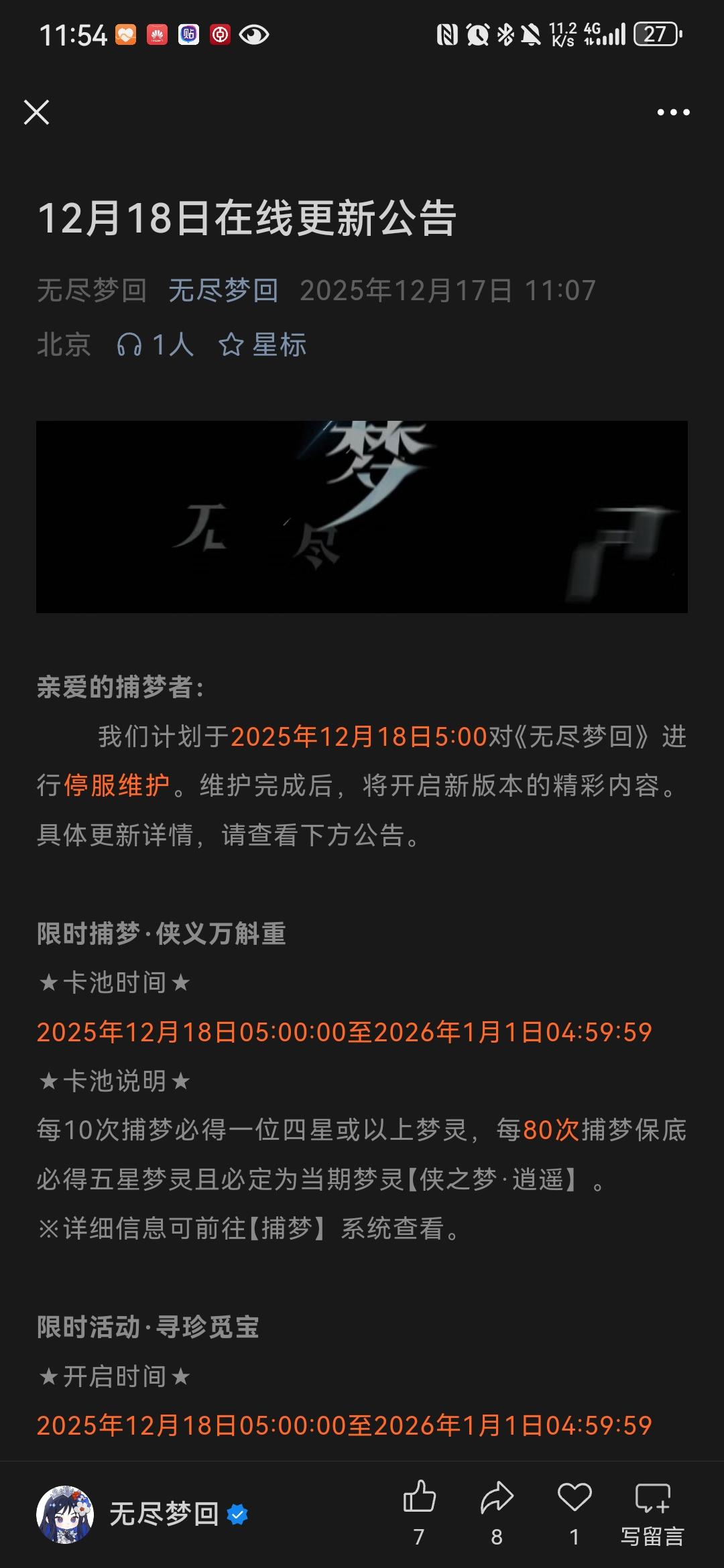 12月8日消息,游戏发行方大宇资讯宣布「因应诸多不可抗力之因素」,《无尽梦回》台港澳新马服务器将于2025年12月31日正式结束运营。《无尽梦回》是一款由快手旗下弹指宇宙研发的Roguelike俯视角二游ARPG,由博博(陈彦江)担任制作人、快手游戏业务负责人徐杰也参与制作,是快手布局游戏产业的先驱作品。《无尽梦回》国服从25年4月起停止更新,游戏国服官号也自25年6月起停止更新,目前没有任何