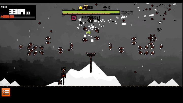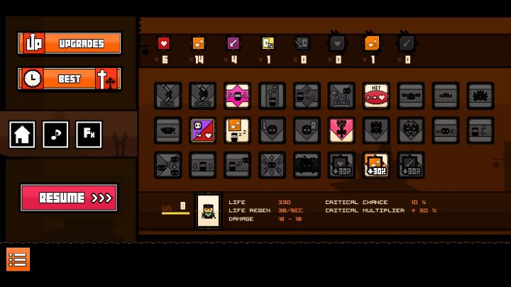 如图,第四关的技能很关键,决定了你这次游戏的流派。一开始我用的飞翔流,在丢了一堆飞镖以后直接飞天等飞镖自己打人,然后发现飞太高会掉血,而且远程怪的攻击你们也看不到,于是通关时是900+秒后来发现了回血流,HP叠高回血叠高保证不死然后随便输出,时间下降到700左右,但是觉得效果还是不够理想,因为这样就输出不够了最后发现了恶魔套,牺牲百分比血量往最近的敌人发射子弹,经过研究在50血时升过一次10