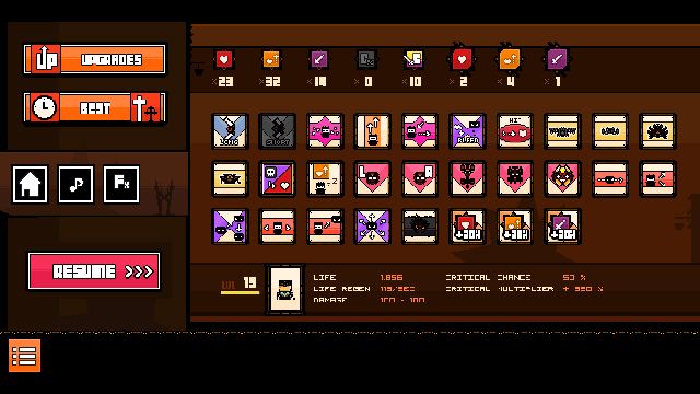 如图,第四关的技能很关键,决定了你这次游戏的流派。一开始我用的飞翔流,在丢了一堆飞镖以后直接飞天等飞镖自己打人,然后发现飞太高会掉血,而且远程怪的攻击你们也看不到,于是通关时是900+秒后来发现了回血流,HP叠高回血叠高保证不死然后随便输出,时间下降到700左右,但是觉得效果还是不够理想,因为这样就输出不够了最后发现了恶魔套,牺牲百分比血量往最近的敌人发射子弹,经过研究在50血时升过一次10