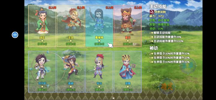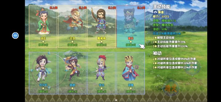 开局先刷武将现在开局2个礼包码20连抽,抽出夏侯双兄弟就可以了,橙色新版本抽不出来。前期装备选择吸血剑,加固伤加固定吸血属属性后期推荐堆装备加剑盾技能等级,技能推荐如图大家可以参考一下,这样堆伤害能打出来一些,不只是靠反伤打伤害