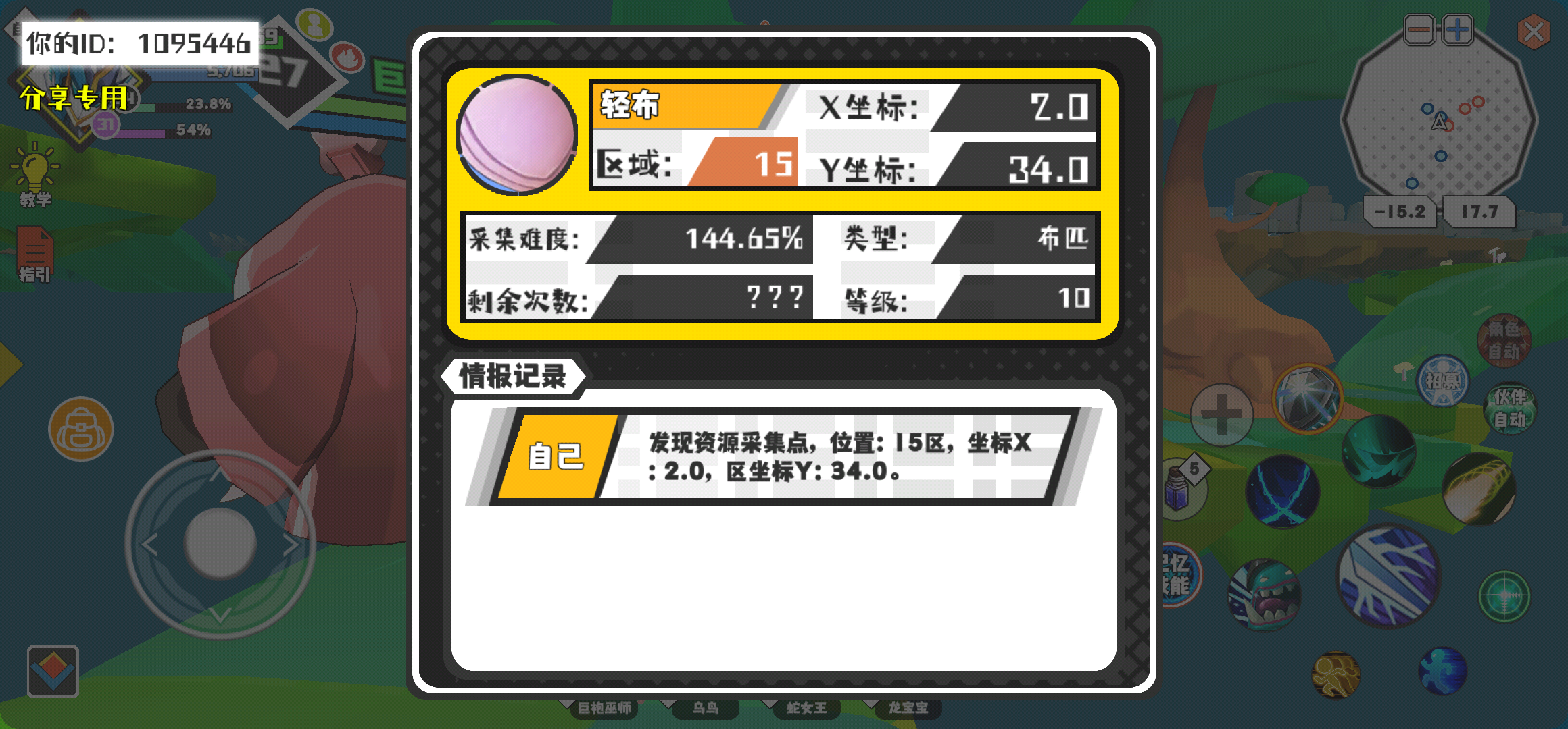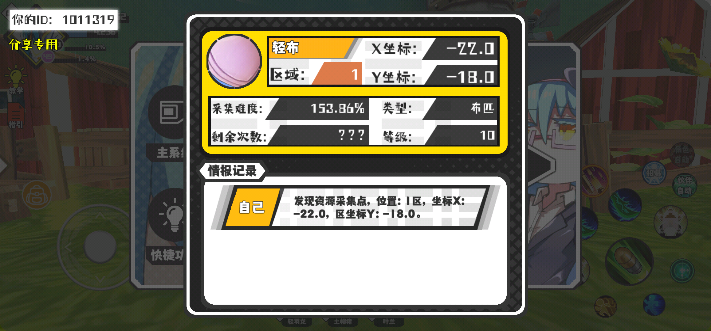 幸运时刻分享! 【资源采集点】7月27日上午11点 - 轻布【10级】 【1区】 【X:-22.0, Y:-18.0】