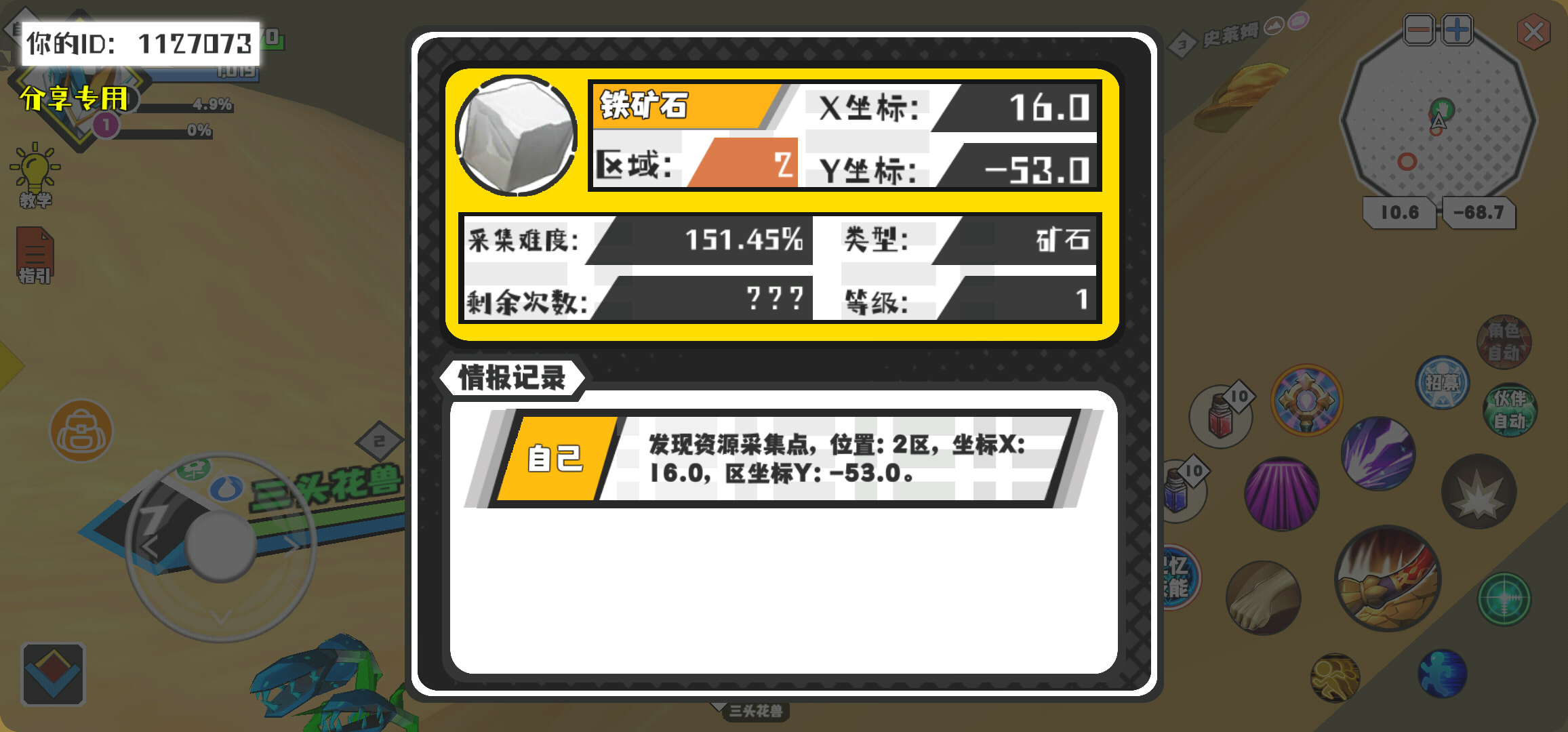 幸运时刻分享! 【资源采集点】8月27日上午3点 - 铁矿石【1级】 【2区】 【X:16.0, Y:-53.0】
