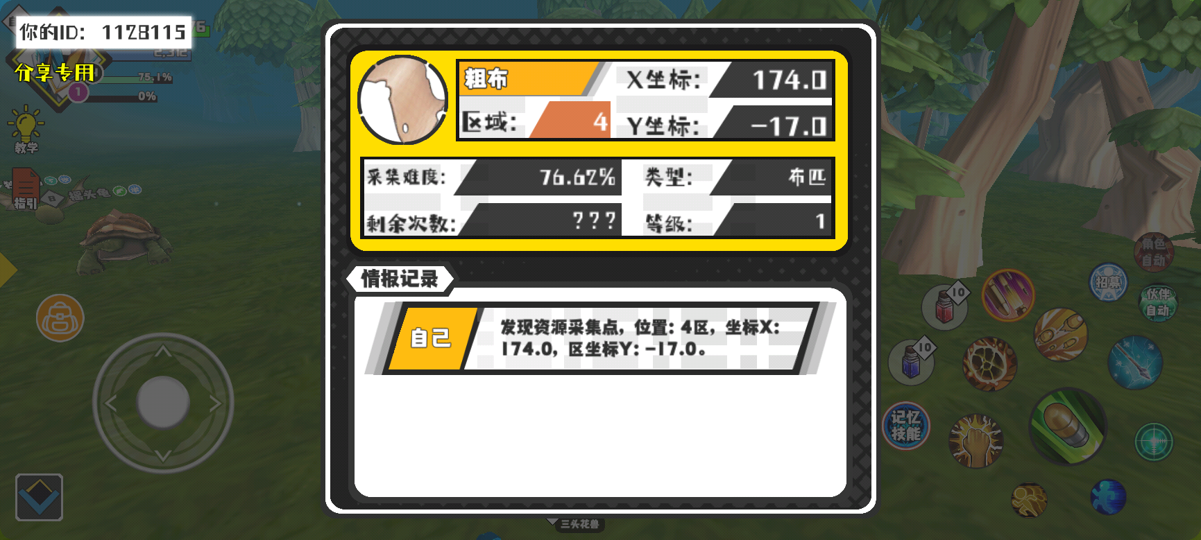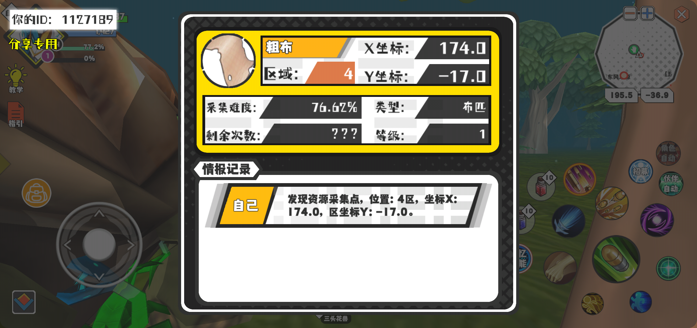 幸运时刻分享! 【资源采集点】8月27日下午11点 - 粗布【1级】 【4区】 【X:174.0, Y:-17.0】
