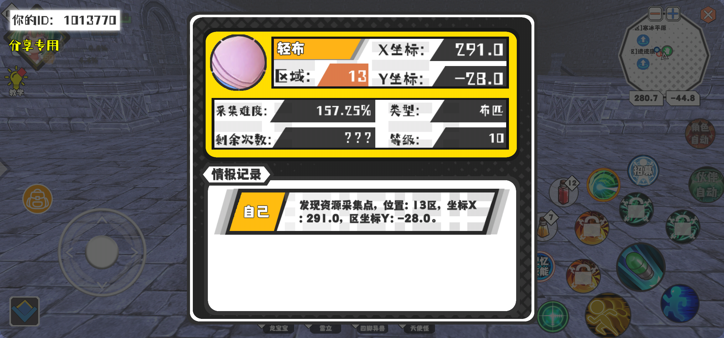 幸运时刻分享! 【资源采集点】8月16日上午12点 - 轻布【10级】 【13区】 【X:291.0, Y:-28.0】