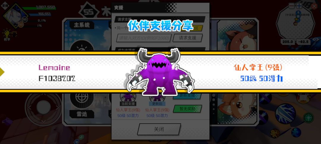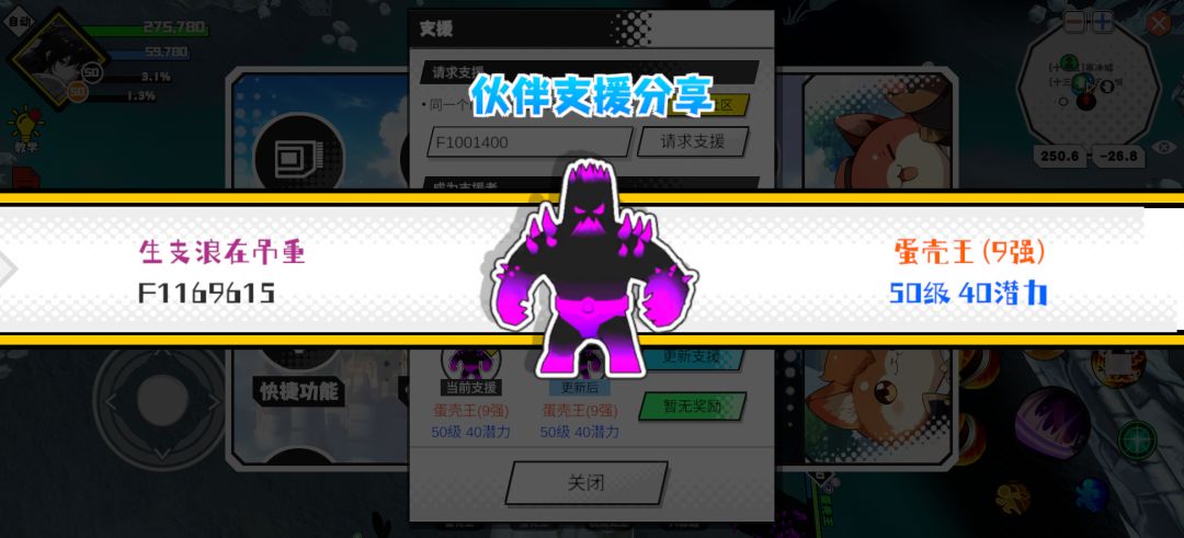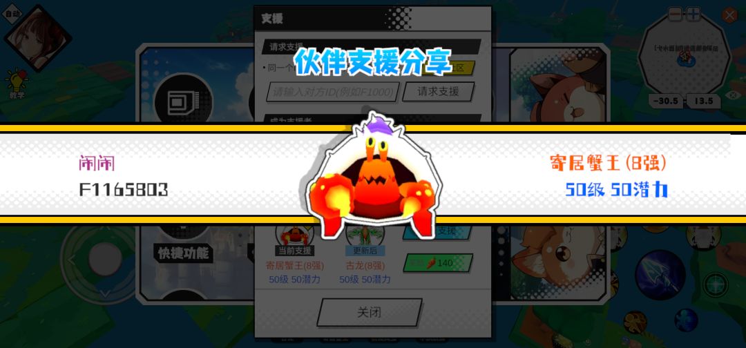 支援者:闹闹(F1165803) 如果遇到困难,可以召唤我的宠物帮忙,召唤方法是进入地图后点击左下角的手机功能>支援>输入【F1165803】>就可以召唤我的宠物! 我的宠物是寄居蟹王(8强) 50级 50潜力 技能1:黑魔破 技能2:黑魔破 技能3:黑魔破 技能4:黑魔破 智慧配点:245 初阶职业:鬼咒 进阶职业:海神 #超数据世界