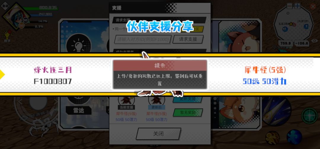 支援者:烽火连三月(F1000807) 如果遇到困难,可以召唤我的宠物帮忙,召唤方法是进入地图后点击左下角的手机功能>支援>输入【F1000807】>就可以召唤我的宠物! 我的宠物是犀牛怪(5强) 50级 50潜力 技能1:群体吸引 技能2:治疗心得3 技能3:中恢复术 技能4:水灵 体质配点:245 初阶职业:龙目 进阶职业:麟目#超数据世界
