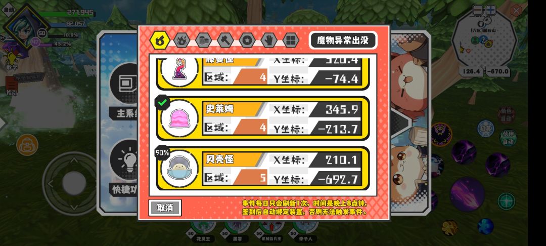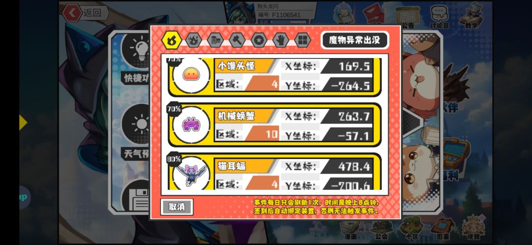 猎场若干,野王差一 强化石:21区所有事件野王 ps:钢筋铁骨大尾兔,光属性,我三阶桩一跳600万的黑魔破打它只有5万伤害,并且它反手就能揍我100万(白天),各位挑战时自行斟酌。 红晶石:5区熊怪 今日宠物捕捉推荐 :机械螃蟹(暗) 小尖刺鼠 (冰) 矿点和其余重要事件放在评论区自取