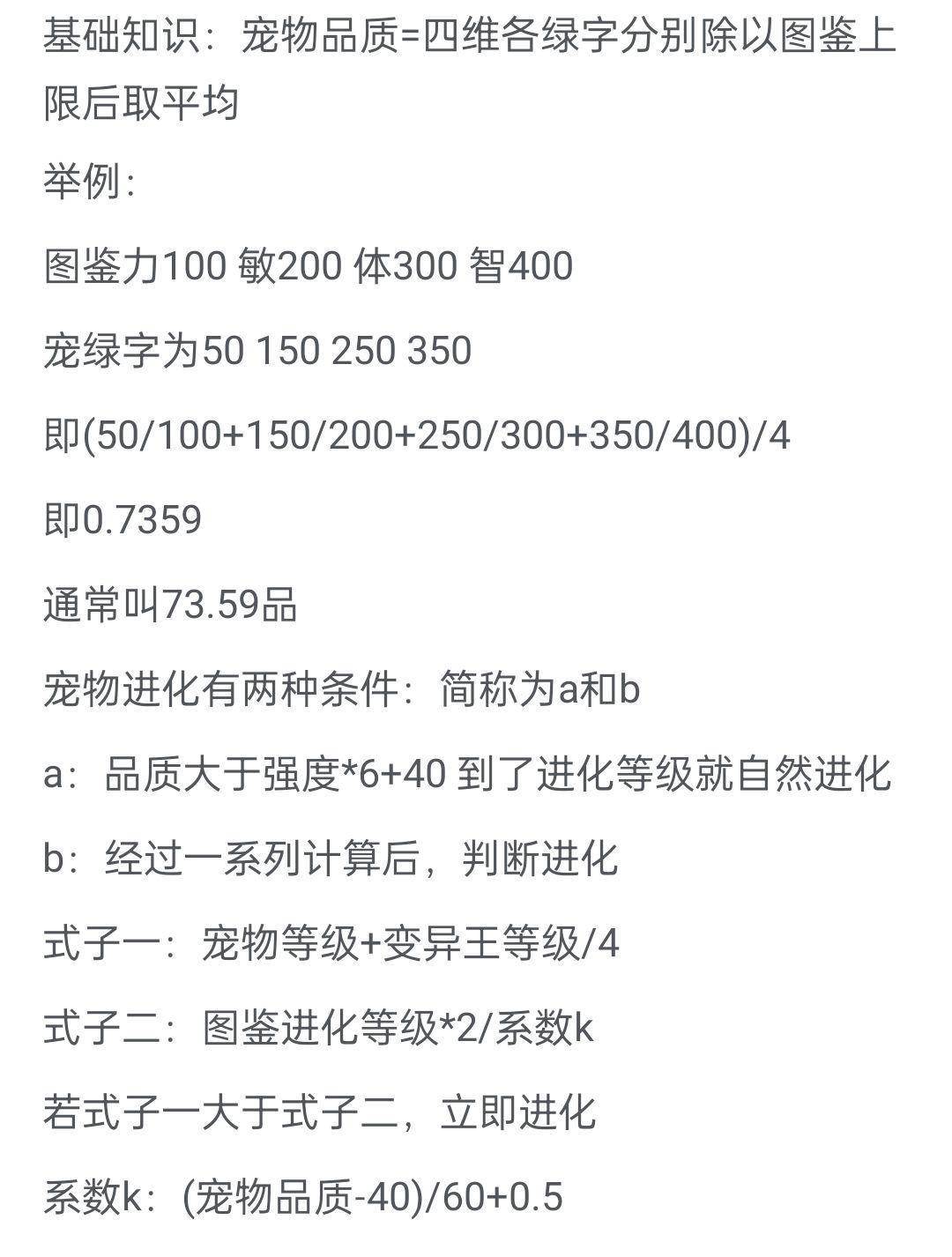 以下皆为根据st所说的总结 基础知识:宠物品质=四维各绿字分别除以图鉴上限后取平均 举例: 图鉴力100 敏200 体300 智400 宠绿字为50 150 250 350 即(50/100+150/200+250/300+350/400)/4 即0.7359 通常叫73.59品 宠物进化有两种条件:简称为a和b a:品质大于强度*6+40 到了进化等级就自然进化 b:经过一系列计算后,判断进化 式