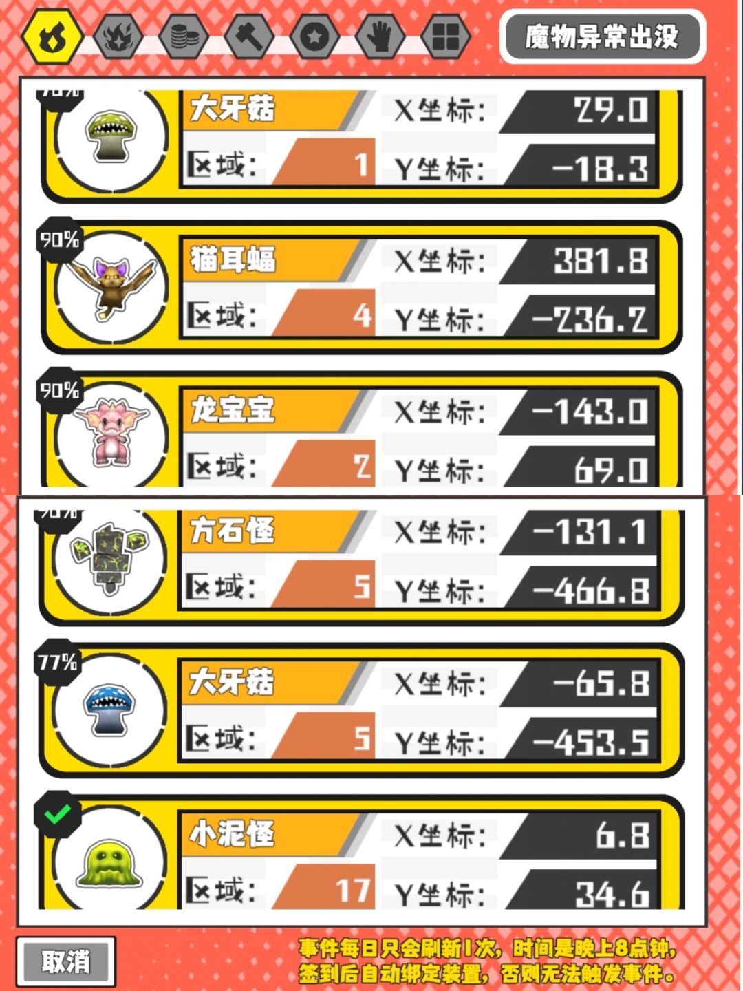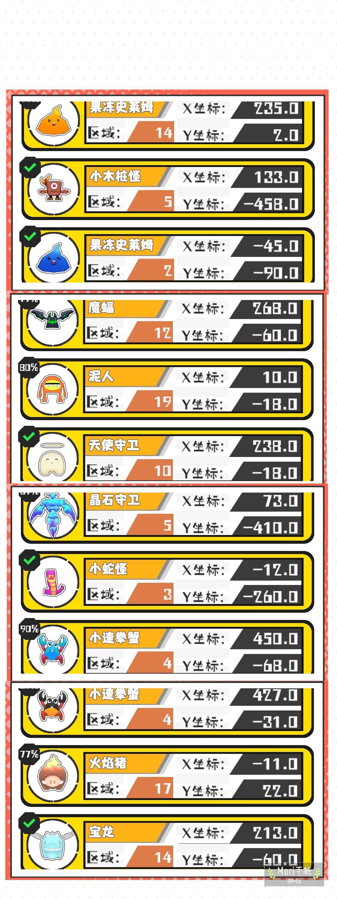 一区 (雷)大嘴花王 (光)钻地虫王 紫火 (无)钢铁巨蟹 二区 (光)岩石怪 (草)巨拳蝎 紫火 (风)巨鸟 三区 (草)史莱姆王 (火)岩石怪 紫火 (风)冠龙 四区 (草)螳螂蛛 (无)沙漠仙人掌 紫火 (冰)虫龙兽 无尽之海 (光)鲸鱼 (无)鲨鱼 五区 (雷)风行鹰 紫火 (草)小荒 六区 (冰)独眼博士 (雷)人马战士 (火)钢铁龙 紫火 (地)大炮 七区 (冰)岩石怪 (冰)森石怪