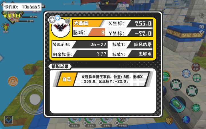 #超数据世界 幸运时刻分享! 【野王异常出没】3月8日上午1点 - 大鼻蝠【强度0】 【8区】 【X:255.0, Y:-22.0】