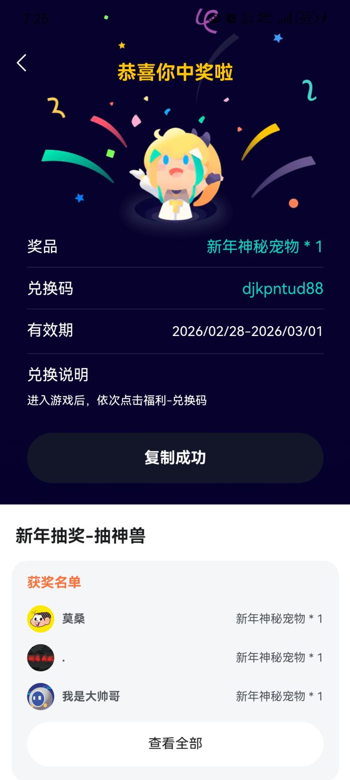 抽奖日期即日起至3月31日结算这期抽奖共送出1000份兑换码!*为防止工作室倒卖兑换码,兑换码将在26年4月1日晚上9点失效兑换码奖励为:以下5个宠物之一的兑换码防止工作室贩卖,兑换码不会显示宠物名字,但实际上发给你的兑换码已经决定它是哪个宠物。10强 圣风灭神龙(共20份 )特别加码9强 异眼王(共40份)特别加码8强 鲨齿龙(共100份)特别加码7强 四角蝠(共220份)6
