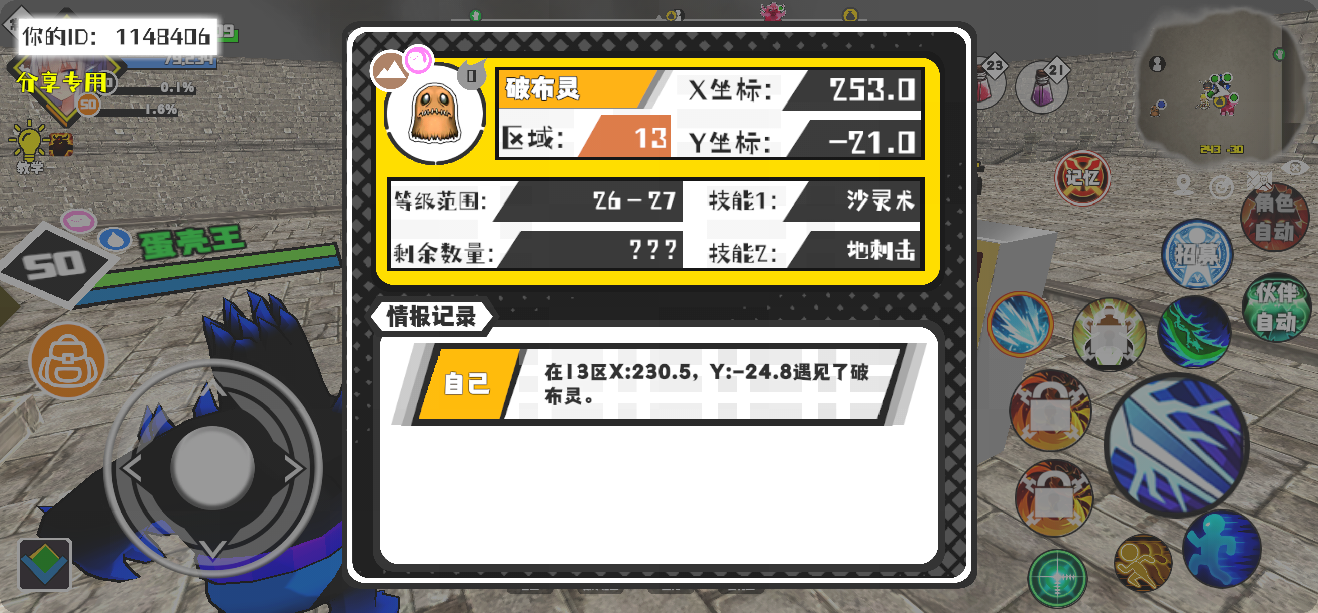 支援者:一念执着(F1099111)如果遇到困难,可以召唤我的宠物帮忙,召唤方法是进入地图后点击左下角的手机功能>支援>输入【F1099111】>就可以召唤我的宠物!我的宠物是蛋壳王(9强)50级 50潜力技能1:黑魔破技能2:黑魔破技能3:黑魔破技能4:黑魔破智慧配点:245初阶职业:鬼咒进阶职业:海神#超数据世界