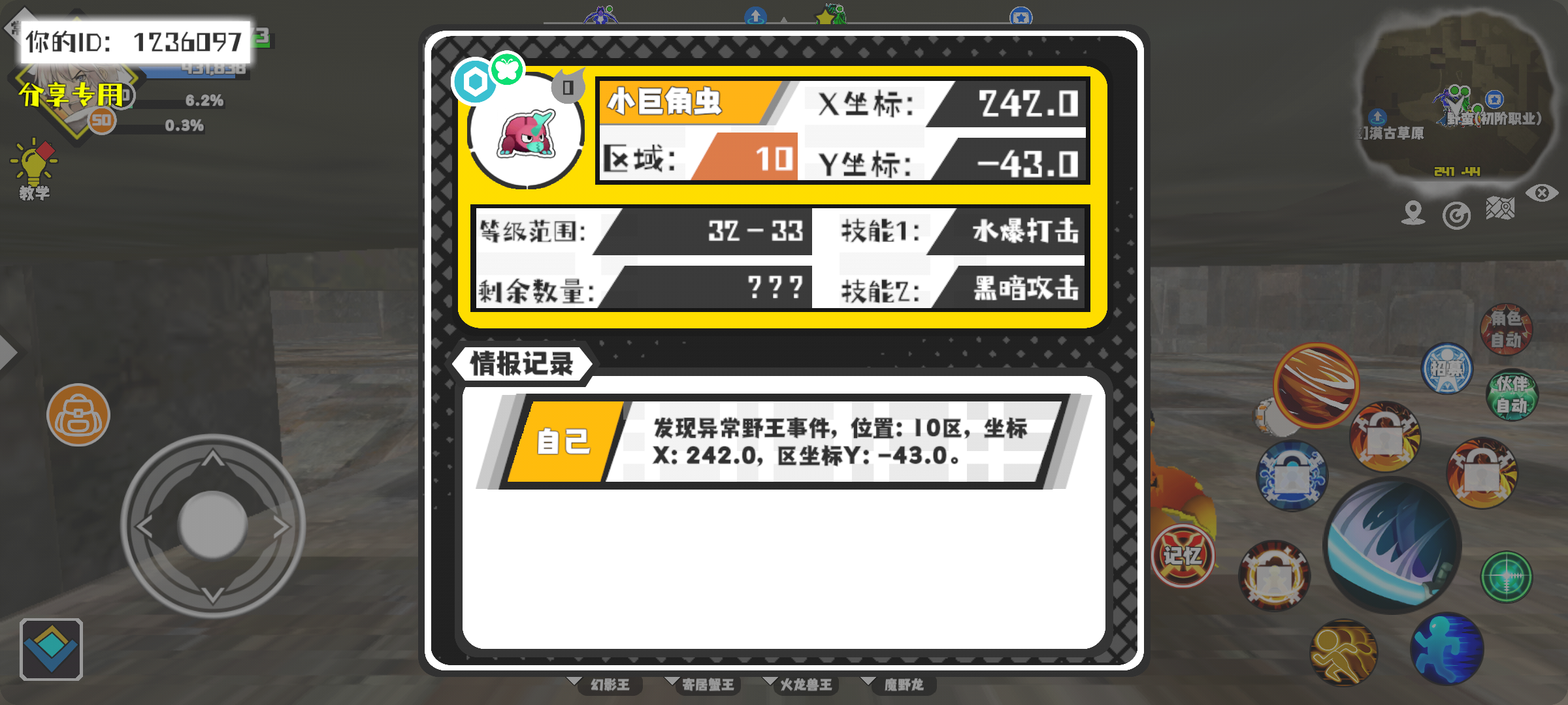 幸运时刻分享! 【野王异常出没】1月24日下午6点 - 小巨角虫【强度0】 【10区】 【X:242.0, Y:-43.0】#超数据世界