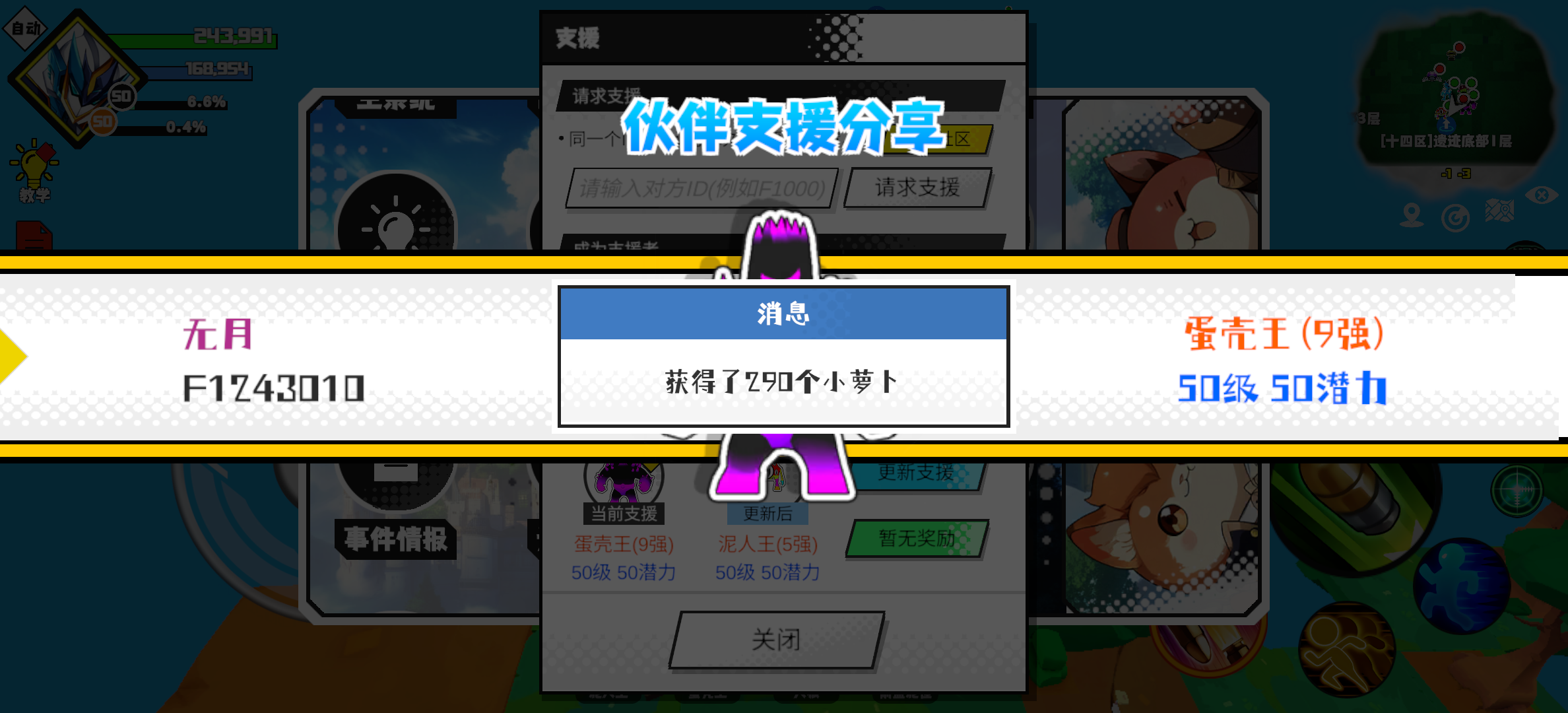 支援者:无月(F1243010)如果遇到困难,可以召唤我的宠物帮忙,召唤方法是进入地图后点击左下角的手机功能>支援>输入【F1243010】>就可以召唤我的宠物!我的宠物是蛋壳王(9强)50级 50潜力技能1:黑魔破技能2:黑魔破技能3:黑魔破技能4:黑魔破智慧配点:245初阶职业:鬼咒进阶职业:海神#超数据世界