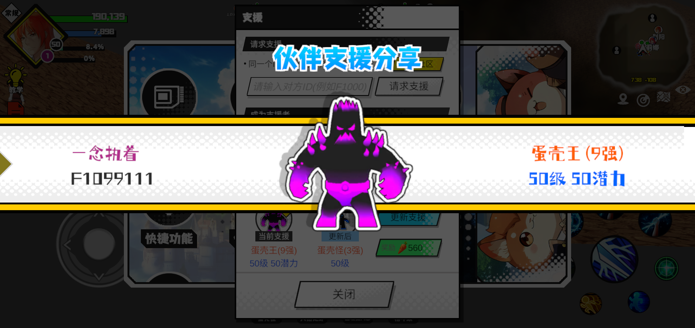支援者:一念执着(F1099111)如果遇到困难,可以召唤我的宠物帮忙,召唤方法是进入地图后点击左下角的手机功能>支援>输入【F1099111】>就可以召唤我的宠物!我的宠物是蛋壳王(9强)50级 50潜力技能1:黑魔破技能2:黑魔破技能3:黑魔破技能4:黑魔破智慧配点:245初阶职业:鬼咒进阶职业:海神#超数据世界