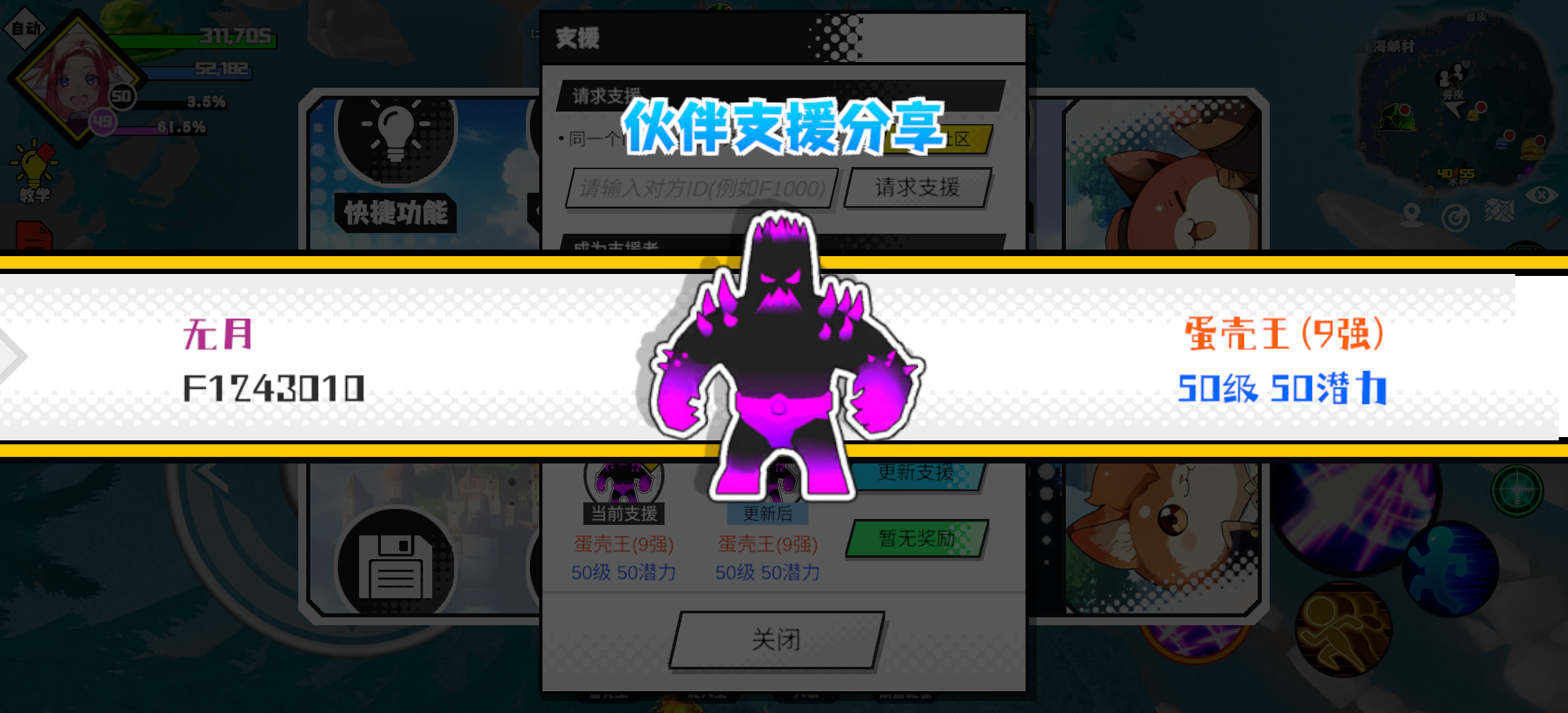 支援者:无月(F1243010)如果遇到困难,可以召唤我的宠物帮忙,召唤方法是进入地图后点击左下角的手机功能>支援>输入【F1243010】>就可以召唤我的宠物!我的宠物是蛋壳王(9强)50级 50潜力技能1:黑魔破技能2:黑魔破技能3:黑魔破技能4:黑魔破智慧配点:245初阶职业:鬼咒进阶职业:海神#超数据世界