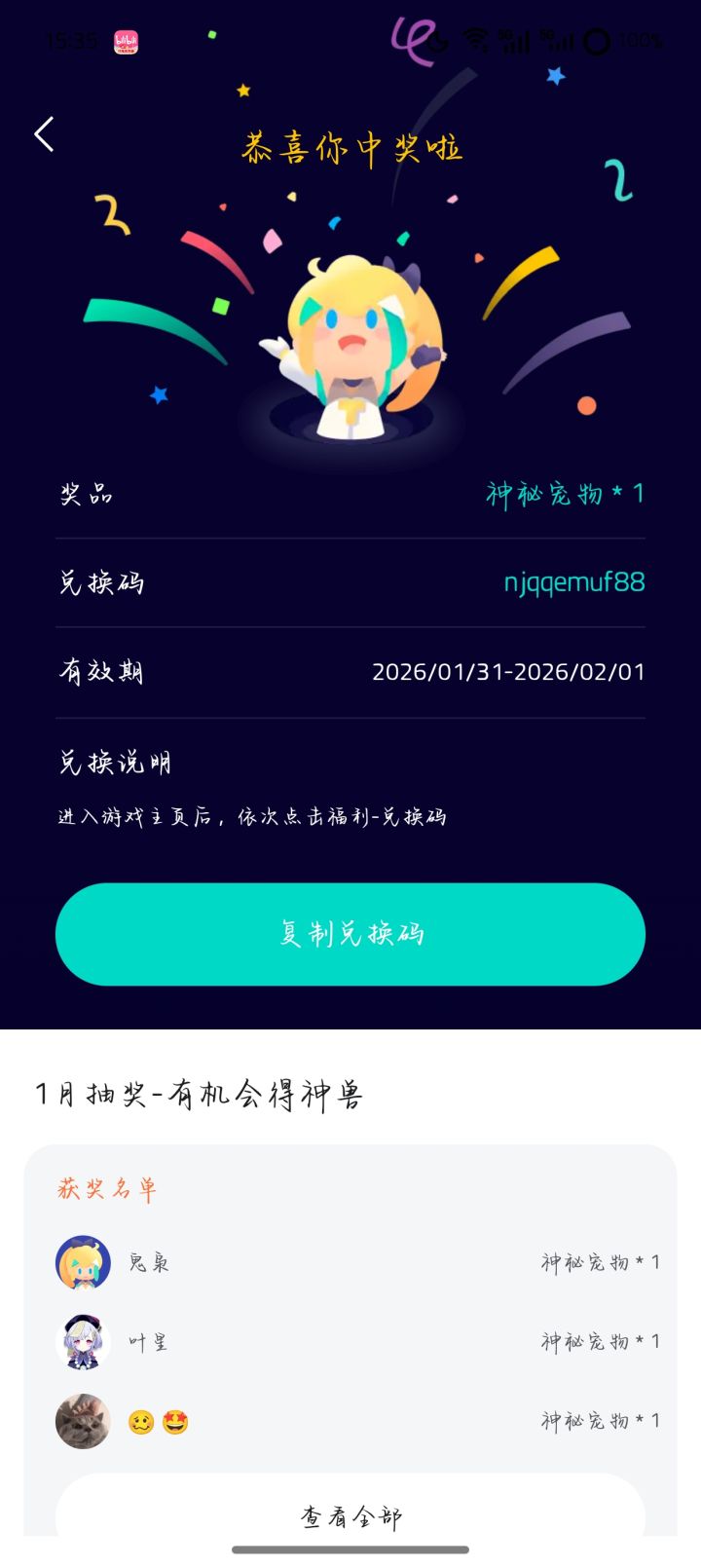 抽奖日期即日起至2月28日结算这期抽奖共送出1000份兑换码!*为防止工作室倒卖兑换码,兑换码将在26年3月1日晚上9点失效兑换码奖励为:以下5个宠物之一的兑换码防止工作室贩卖,兑换码不会显示宠物名字,但实际上发给你的兑换码已经决定它是哪个宠物。10强 圣风灭神龙(共20份 )新年加码9强 异眼王(共40份)新年加码8强 鲨齿龙(共100份)新年加码7强 四角蝠(共220份)6