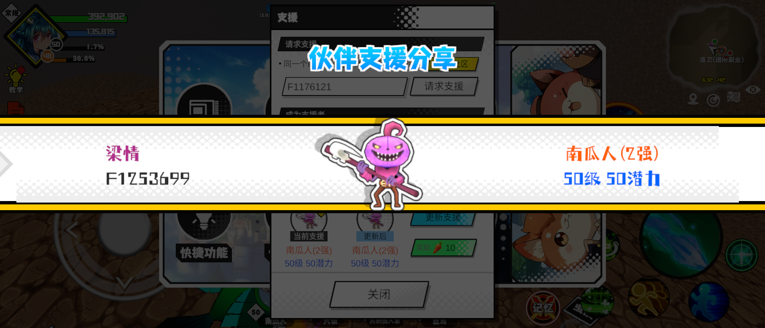 支援者:梁情(F1253699)如果遇到困难,可以召唤我的宠物帮忙,召唤方法是进入地图后点击左下角的手机功能>支援>输入【F1253699】>就可以召唤我的宠物!我的宠物是南瓜人(2强)50级 50潜力技能1:水龙击技能2:神圣嘲讽技能3:魔源技能4:猛击力量配点:129敏捷配点:116初阶职业:野蛮进阶职业:盾卫#超数据世界