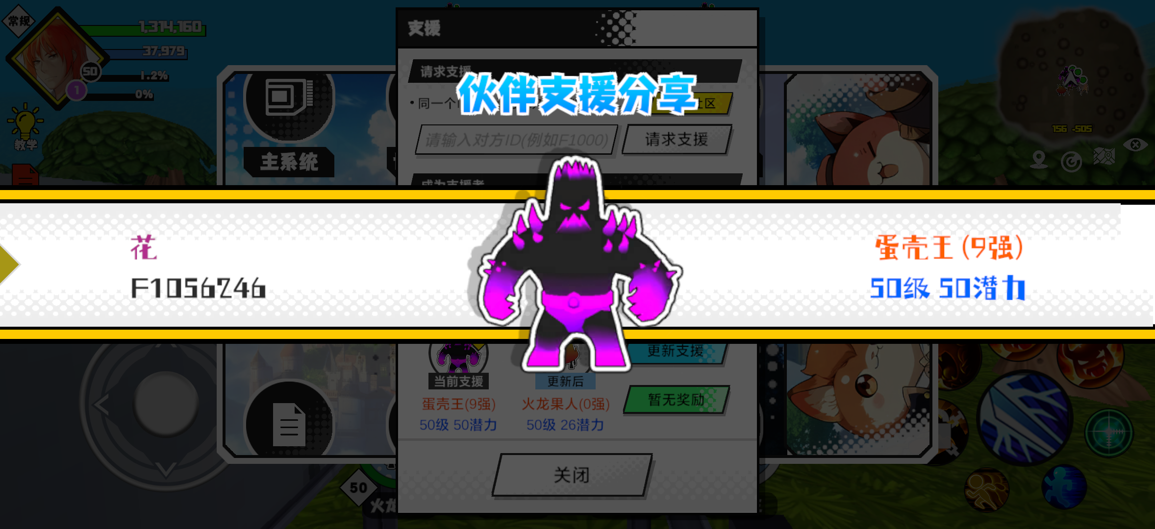 支援者:花(F1056246)如果遇到困难,可以召唤我的宠物帮忙,召唤方法是进入地图后点击左下角的手机功能>支援>输入【F1056246】>就可以召唤我的宠物!我的宠物是蛋壳王(9强)50级 50潜力技能1:黑魔破技能2:黑魔破技能3:黑魔破技能4:魔力流动智慧配点:245初阶职业:鬼咒进阶职业:海神#超数据世界