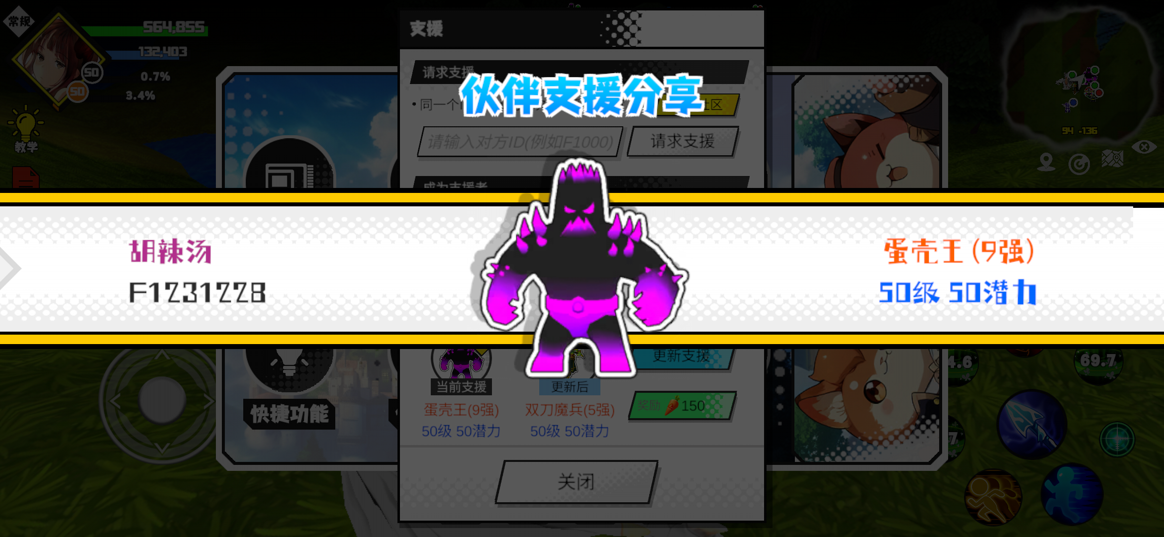 支援者:胡辣汤(F1231228)如果遇到困难,可以召唤我的宠物帮忙,召唤方法是进入地图后点击左下角的手机功能>支援>输入【F1231228】>就可以召唤我的宠物!我的宠物是蛋壳王(9强)50级 50潜力技能1:魔源技能2:黑魔破技能3:黑魔破技能4:黑魔破智慧配点:245初阶职业:鬼咒进阶职业:海神#超数据世界