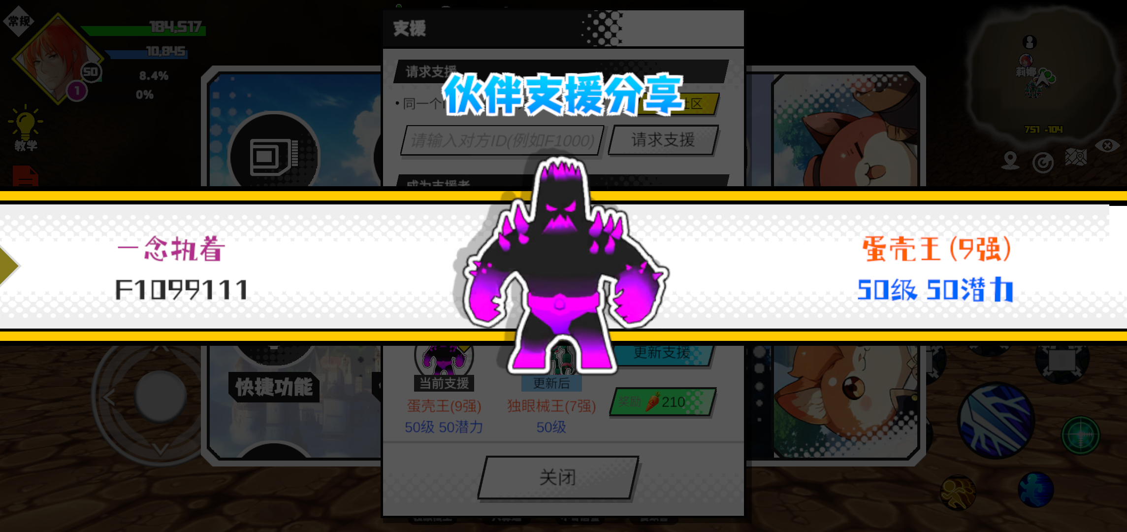 支援者:一念执着(F1099111)如果遇到困难,可以召唤我的宠物帮忙,召唤方法是进入地图后点击左下角的手机功能>支援>输入【F1099111】>就可以召唤我的宠物!我的宠物是蛋壳王(9强)50级 50潜力技能1:黑魔破技能2:黑魔破技能3:黑魔破技能4:黑魔破智慧配点:245初阶职业:鬼咒进阶职业:海神#超数据世界