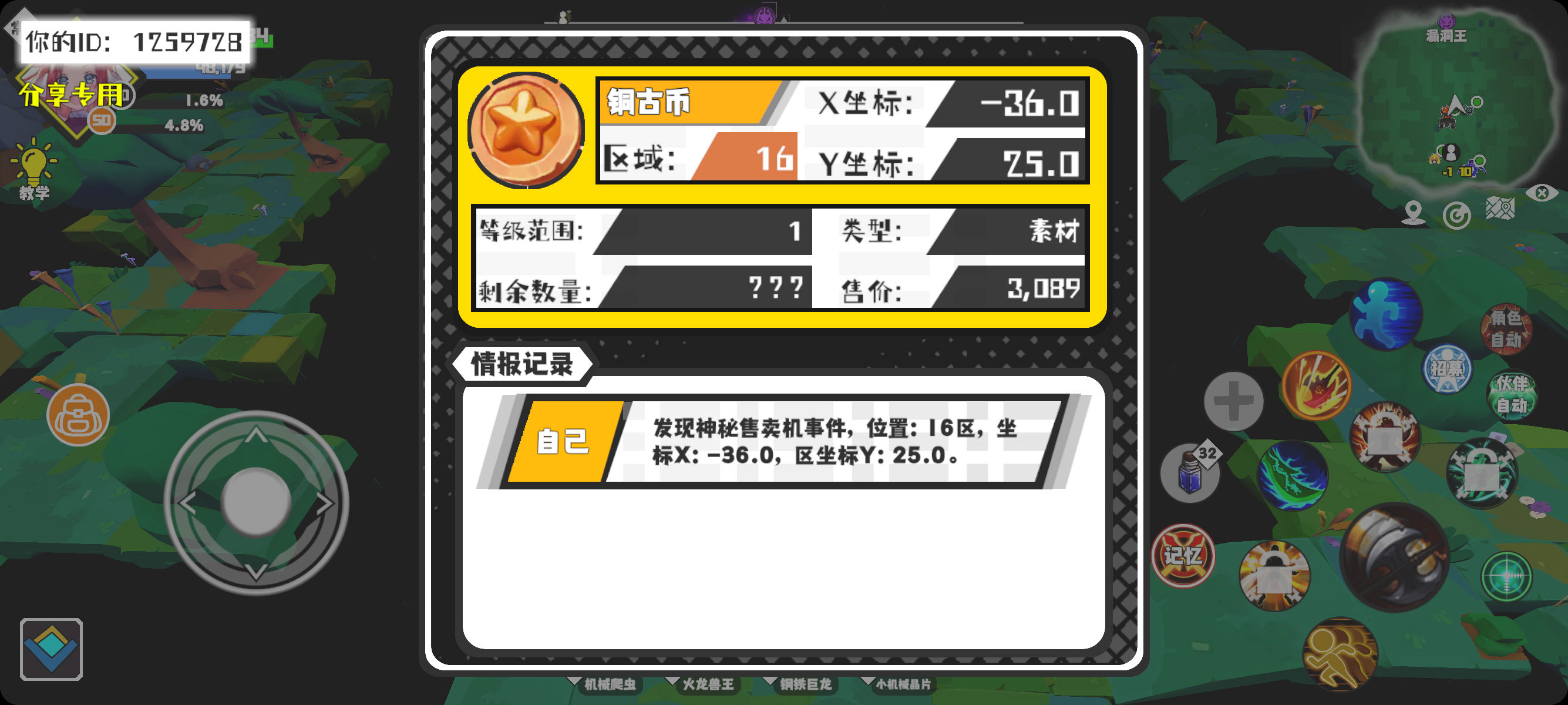 #超数据世界 幸运时刻分享! 【神秘售卖机】1月14日上午10点 - 铜古币【1级 】【稀有度:稀有】 【16区】 【X:-36.0, Y:25.0】