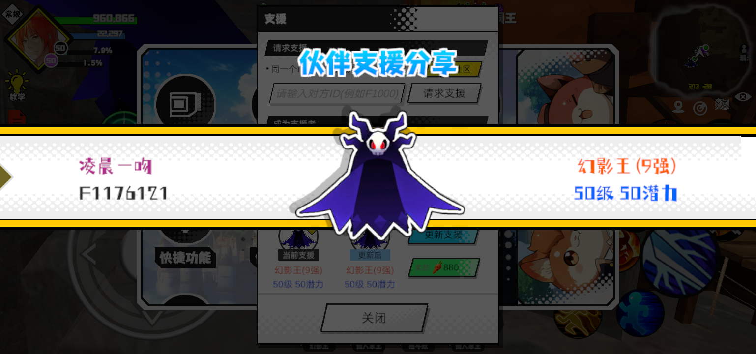 支援者:凌晨一吻(F1176121)如果遇到困难,可以召唤我的宠物帮忙,召唤方法是进入地图后点击左下角的手机功能>支援>输入【F1176121】>就可以召唤我的宠物!我的宠物是幻影王(9强)50级 50潜力技能1:黑魔破技能2:黑魔破技能3:黑魔破技能4:黑魔破智慧配点:245初阶职业:鬼咒进阶职业:海神#超数据世界