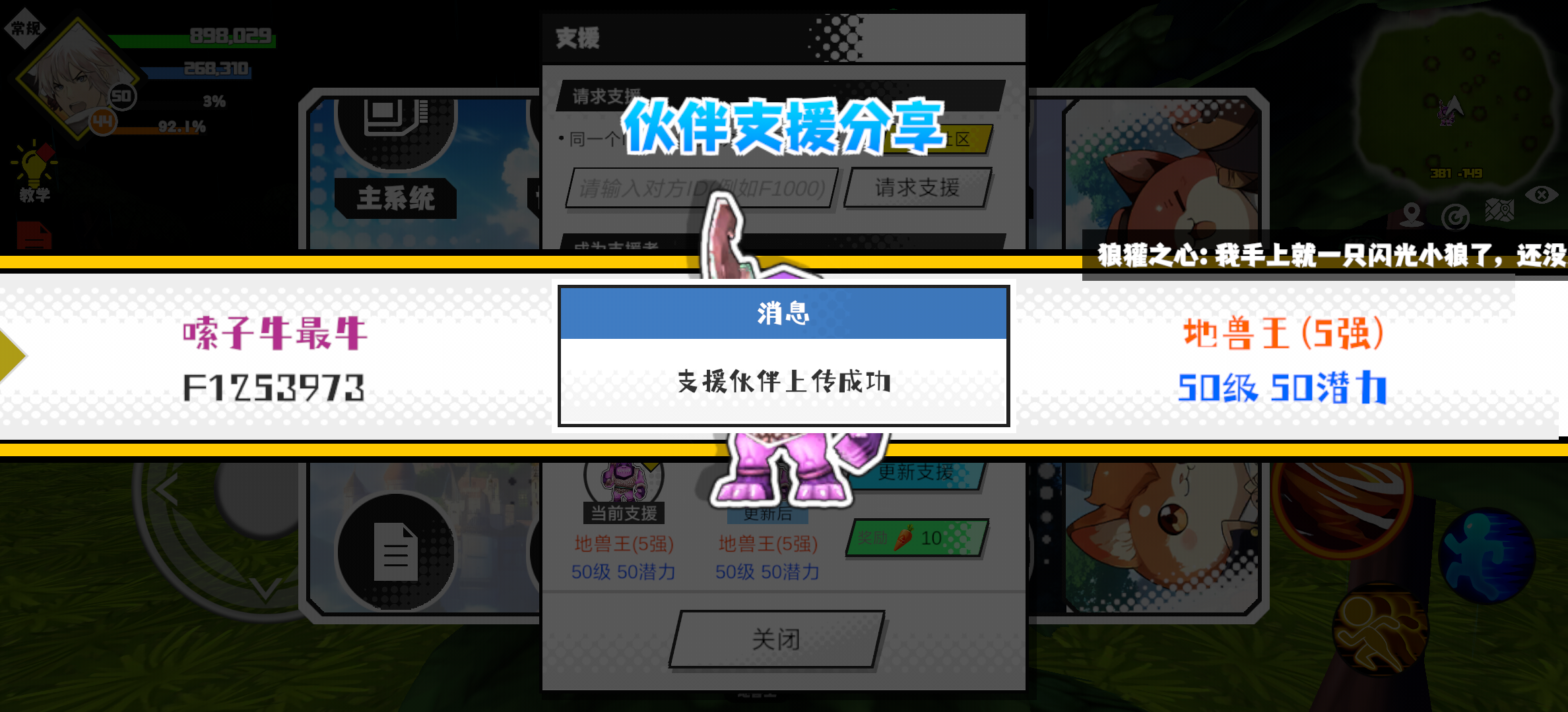 支援者:嗦子牛最牛(F1253973)如果遇到困难,可以召唤我的宠物帮忙,召唤方法是进入地图后点击左下角的手机功能>支援>输入【F1253973】>就可以召唤我的宠物!我的宠物是地兽王(5强)50级 50潜力技能1:魔导之力技能2:魔源技能3:黑魔破技能4:黑魔破智慧配点:245初阶职业:鬼咒进阶职业:海神#超数据世界