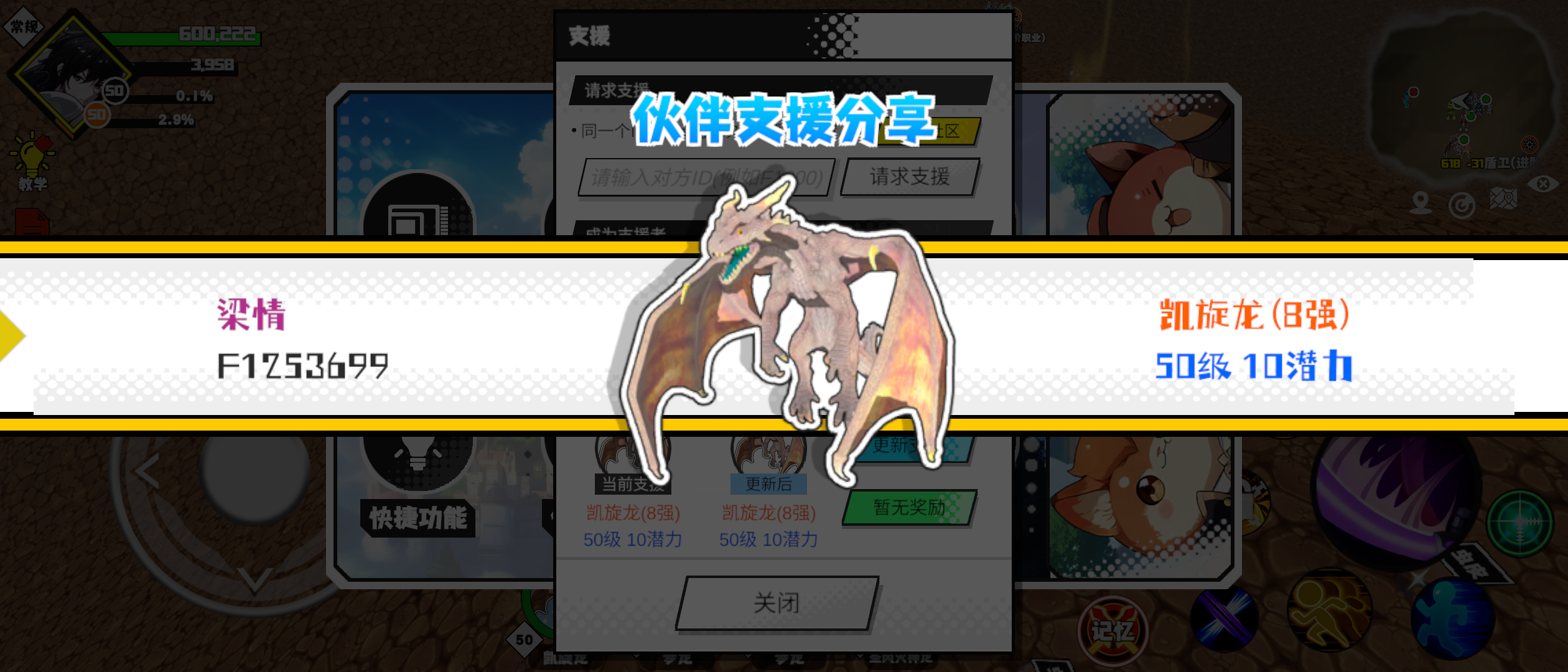 支援者:梁情(F1253699)如果遇到困难,可以召唤我的宠物帮忙,召唤方法是进入地图后点击左下角的手机功能>支援>输入【F1253699】>就可以召唤我的宠物!我的宠物是凯旋龙(8强)50级 10潜力技能1:气功弹技能2:黑魔破技能3:雷破击技能4:暴风烈焰刺力量配点:245初阶职业:全能进阶职业:无极#超数据世界