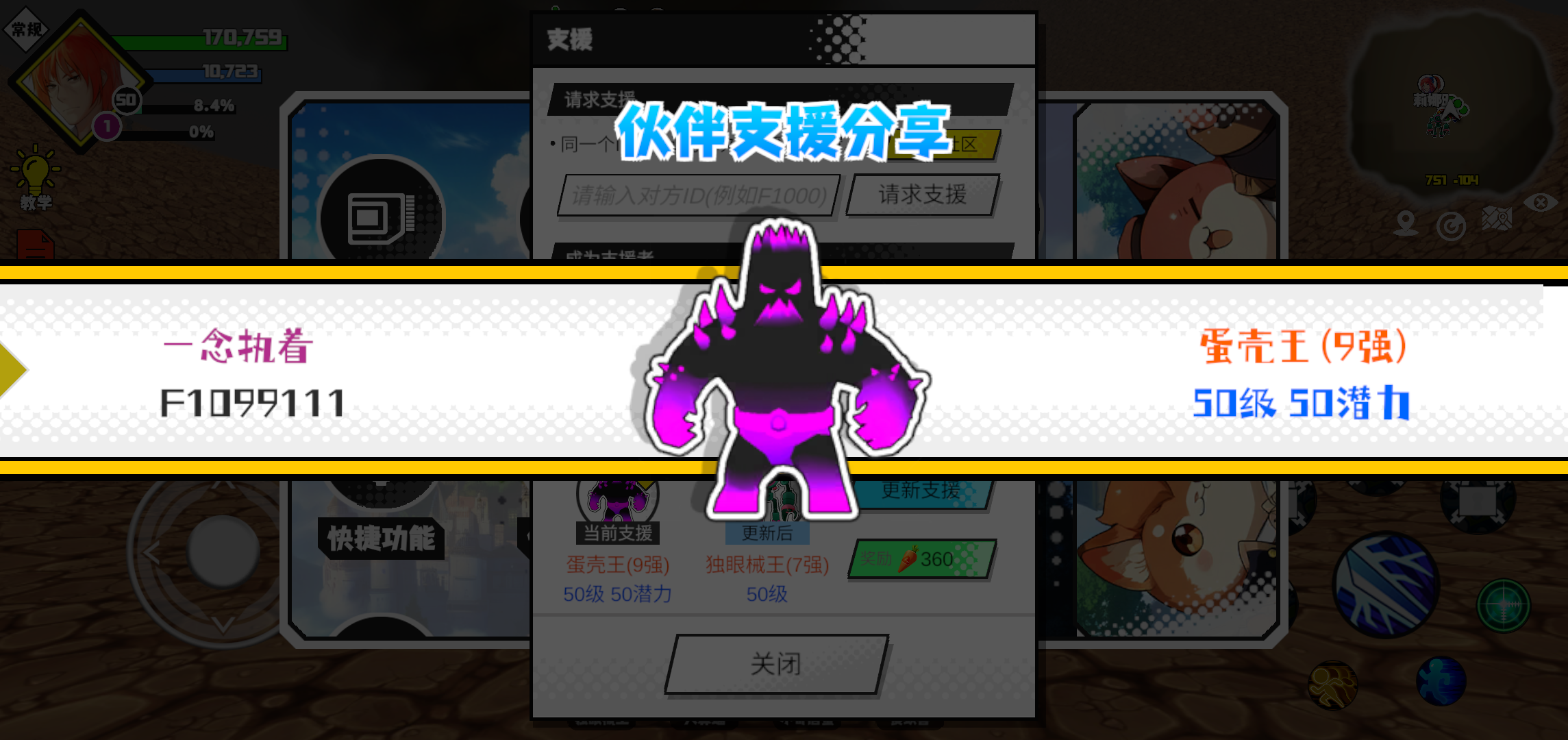 支援者:一念执着(F1099111)如果遇到困难,可以召唤我的宠物帮忙,召唤方法是进入地图后点击左下角的手机功能>支援>输入【F1099111】>就可以召唤我的宠物!我的宠物是蛋壳王(9强)50级 50潜力技能1:黑魔破技能2:黑魔破技能3:黑魔破技能4:黑魔破智慧配点:245初阶职业:鬼咒进阶职业:海神#超数据世界