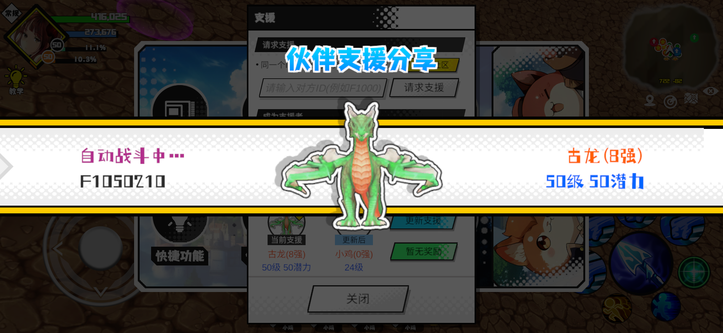 支援者:自动战斗中…(F1050210)如果遇到困难,可以召唤我的宠物帮忙,召唤方法是进入地图后点击左下角的手机功能>支援>输入【F1050210】>就可以召唤我的宠物!我的宠物是古龙(8强)50级 50潜力技能1:中恢复术技能2:中恢复术技能3:中恢复术技能4:治疗心得3力量配点:1敏捷配点:1智慧配点:243初阶职业:商人进阶职业:圣牧#超数据世界