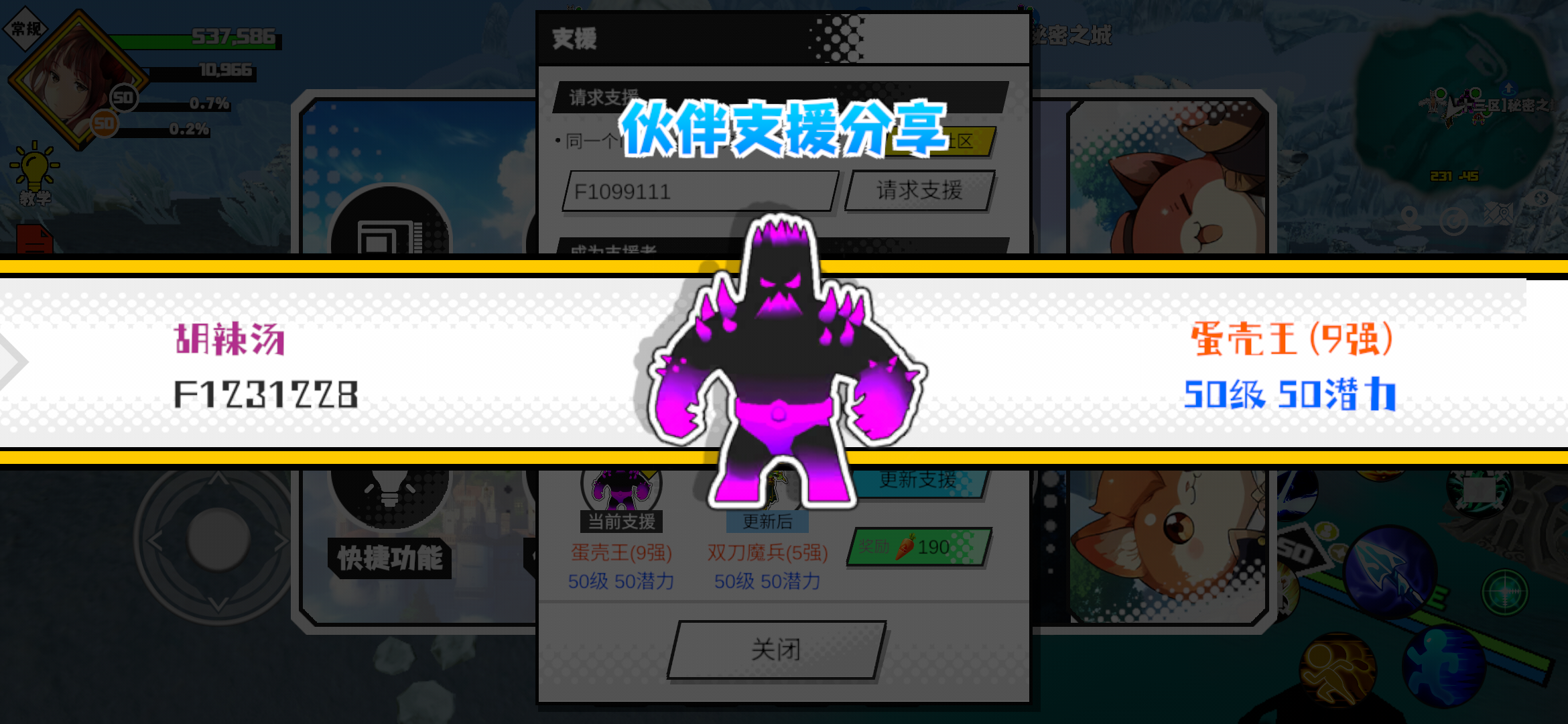 支援者:胡辣汤(F1231228)如果遇到困难,可以召唤我的宠物帮忙,召唤方法是进入地图后点击左下角的手机功能>支援>输入【F1231228】>就可以召唤我的宠物!我的宠物是蛋壳王(9强)50级 50潜力技能1:魔源技能2:黑魔破技能3:黑魔破技能4:黑魔破智慧配点:245初阶职业:鬼咒进阶职业:海神#超数据世界