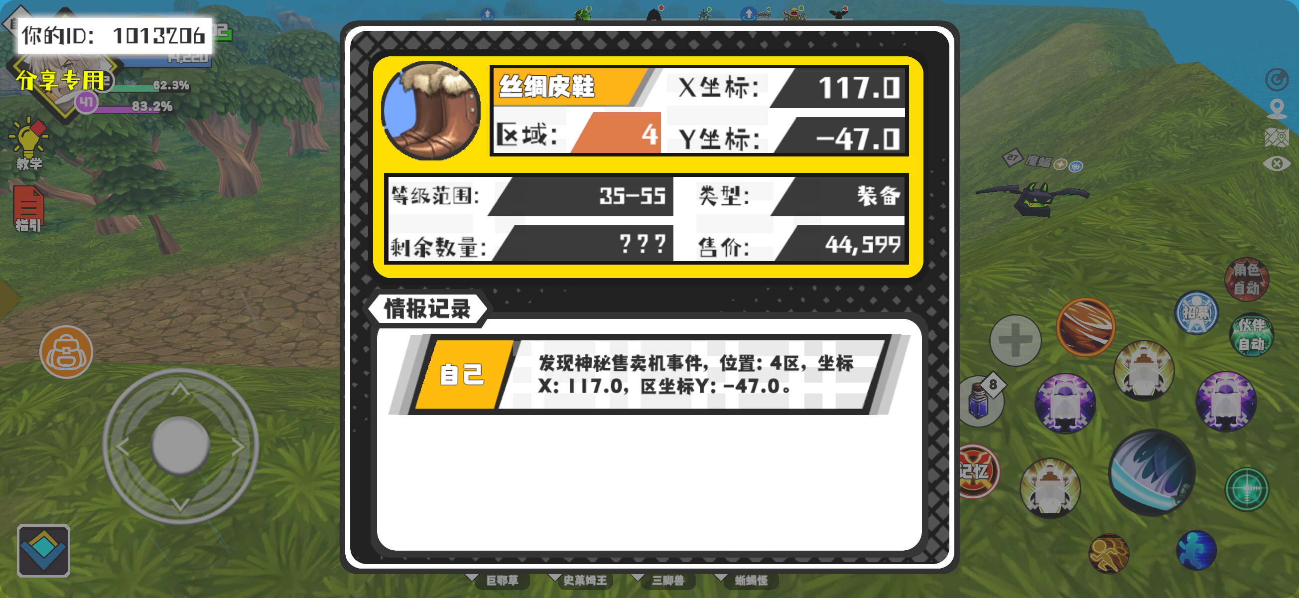 幸运时刻分享! 【神秘售卖机】1月2日上午12点 - 丝绸皮鞋【35-55级 】【稀有度:稀有】 【4区】 【X:117.0, Y:-47.0】#超数据世界