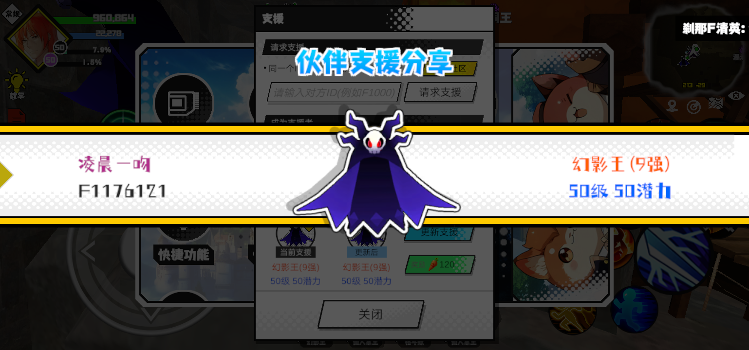支援者:凌晨一吻(F1176121)如果遇到困难,可以召唤我的宠物帮忙,召唤方法是进入地图后点击左下角的手机功能>支援>输入【F1176121】>就可以召唤我的宠物!我的宠物是幻影王(9强)50级 50潜力技能1:黑魔破技能2:黑魔破技能3:黑魔破技能4:黑魔破智慧配点:245初阶职业:鬼咒进阶职业:海神#超数据世界