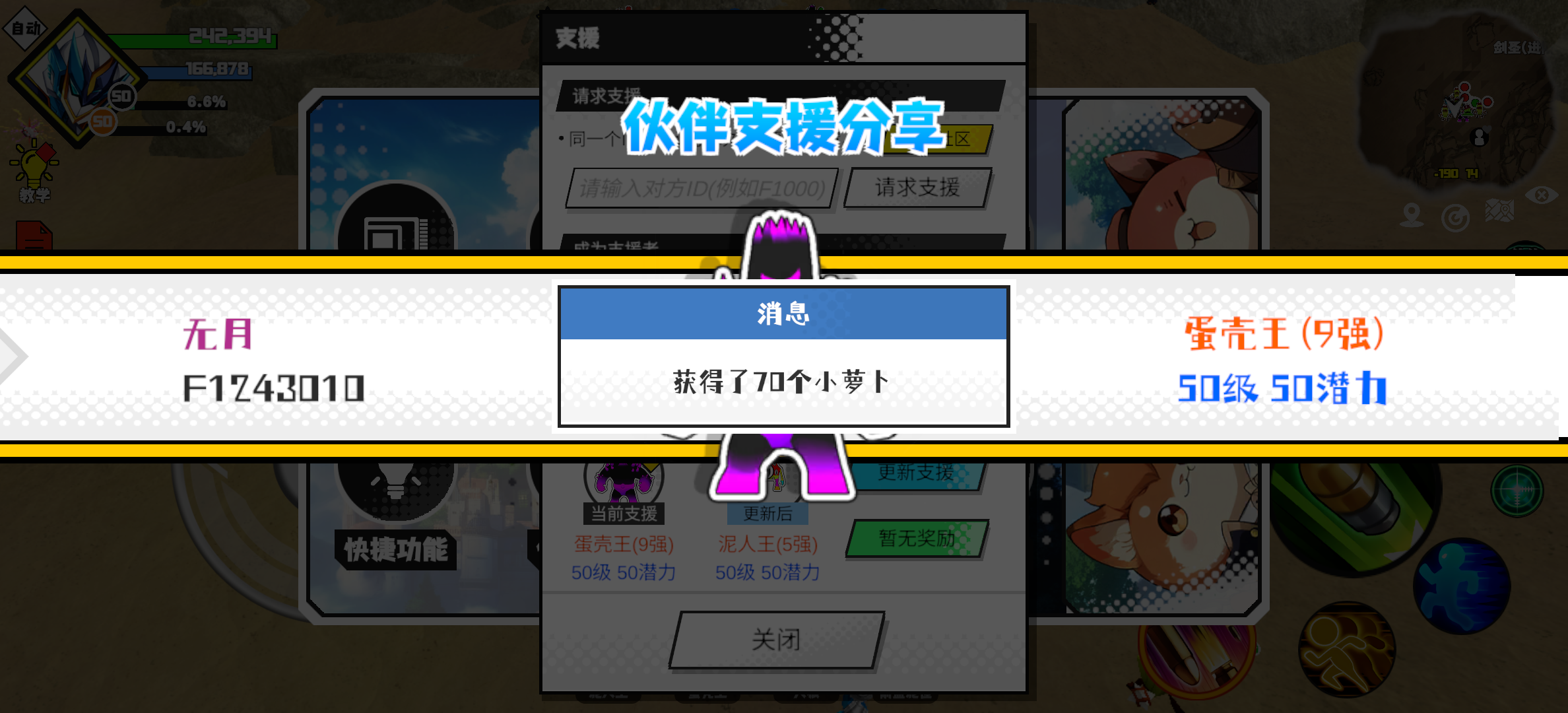 支援者:无月(F1243010)如果遇到困难,可以召唤我的宠物帮忙,召唤方法是进入地图后点击左下角的手机功能>支援>输入【F1243010】>就可以召唤我的宠物!我的宠物是蛋壳王(9强)50级 50潜力技能1:黑魔破技能2:黑魔破技能3:黑魔破技能4:黑魔破智慧配点:245初阶职业:鬼咒进阶职业:海神#超数据世界