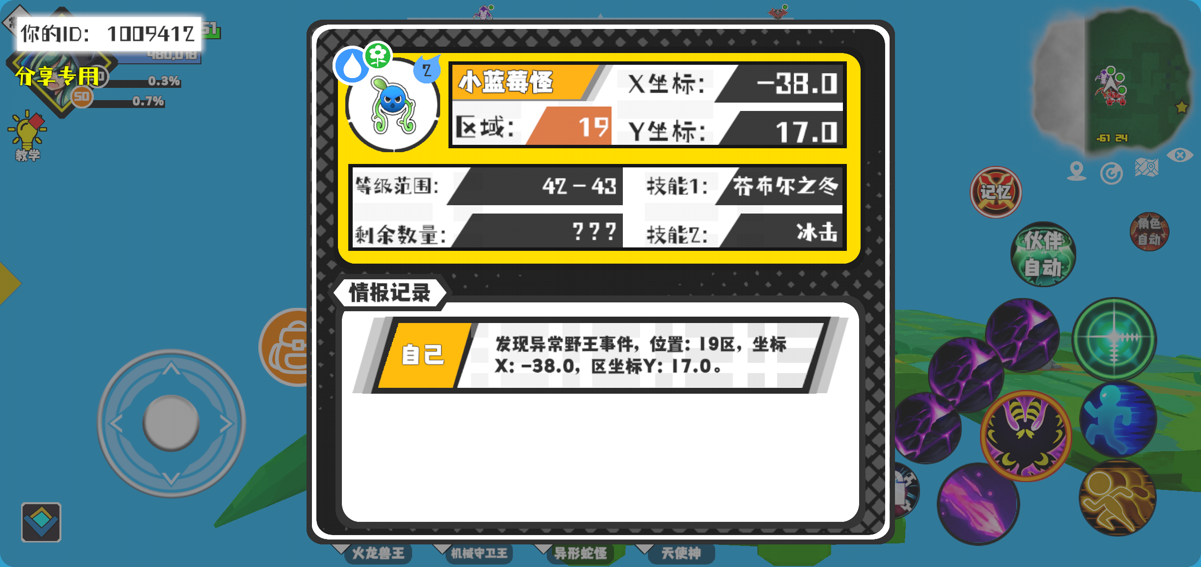 幸运时刻分享! 【野王异常出没】1月21日上午1点 - 小蓝莓怪【强度2】 【19区】 【X:-38.0, Y:17.0】#超数据世界