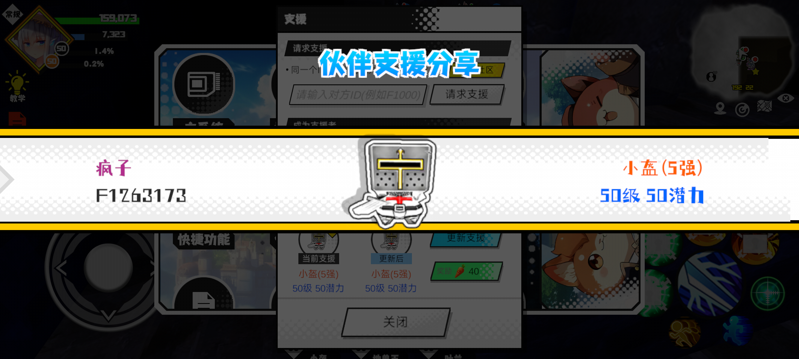 支援者:疯子(F1263173)如果遇到困难,可以召唤我的宠物帮忙,召唤方法是进入地图后点击左下角的手机功能>支援>输入【F1263173】>就可以召唤我的宠物!我的宠物是小盔(5强)50级 50潜力技能1:群体嘲讽技能2:群体嘲讽技能3:水灵技能4:水灵体质配点:245初阶职业:守卫进阶职业:盾卫#超数据世界