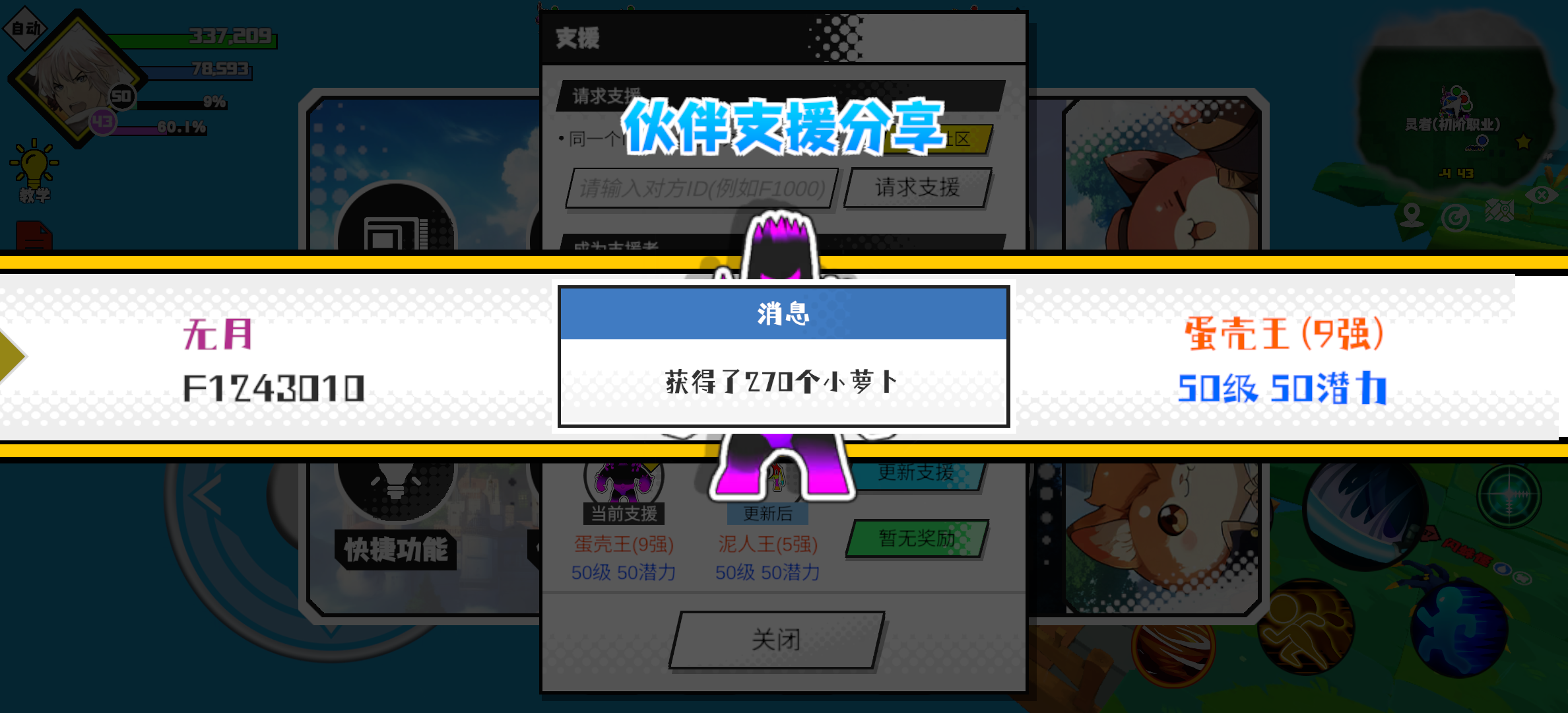 支援者:无月(F1243010)如果遇到困难,可以召唤我的宠物帮忙,召唤方法是进入地图后点击左下角的手机功能>支援>输入【F1243010】>就可以召唤我的宠物!我的宠物是蛋壳王(9强)50级 50潜力技能1:黑魔破技能2:黑魔破技能3:黑魔破技能4:黑魔破智慧配点:245初阶职业:鬼咒进阶职业:海神#超数据世界