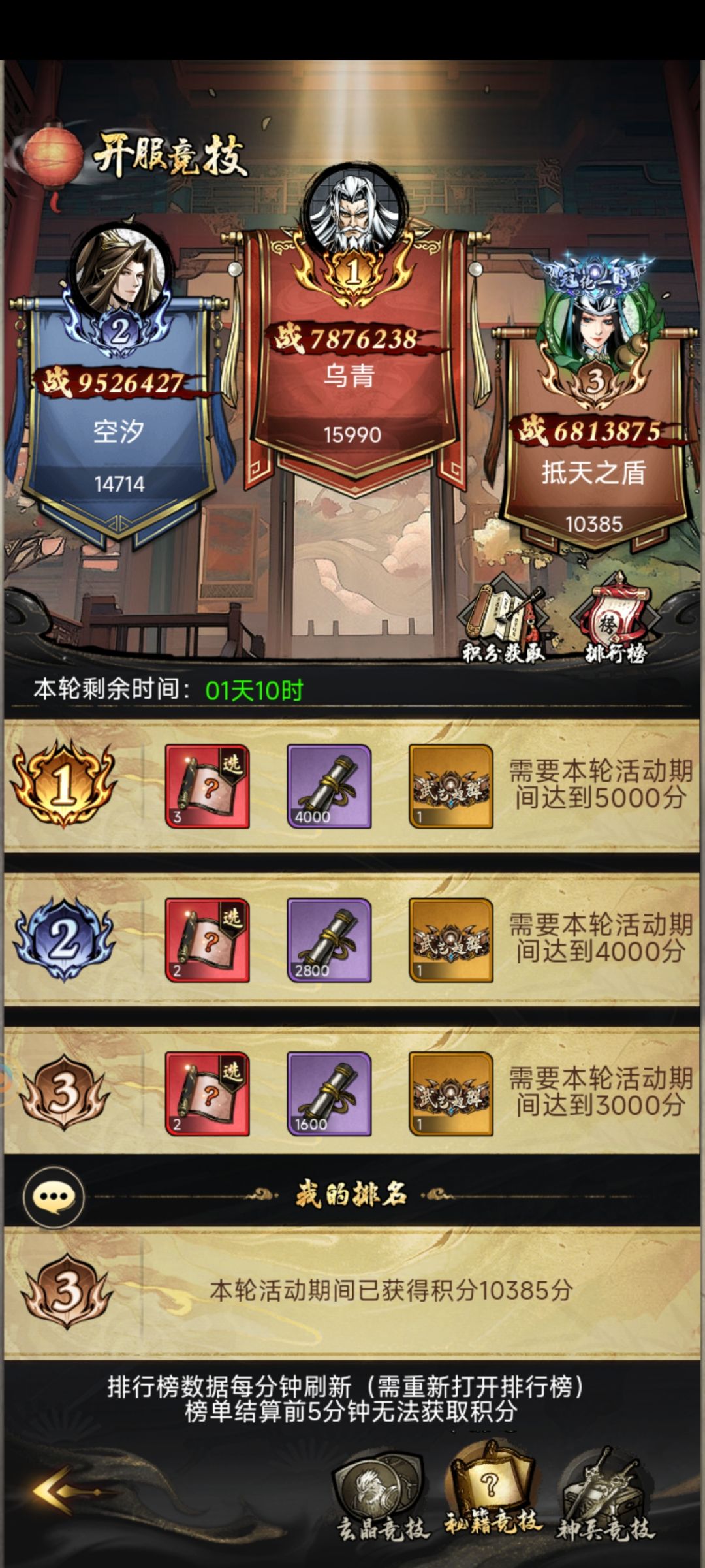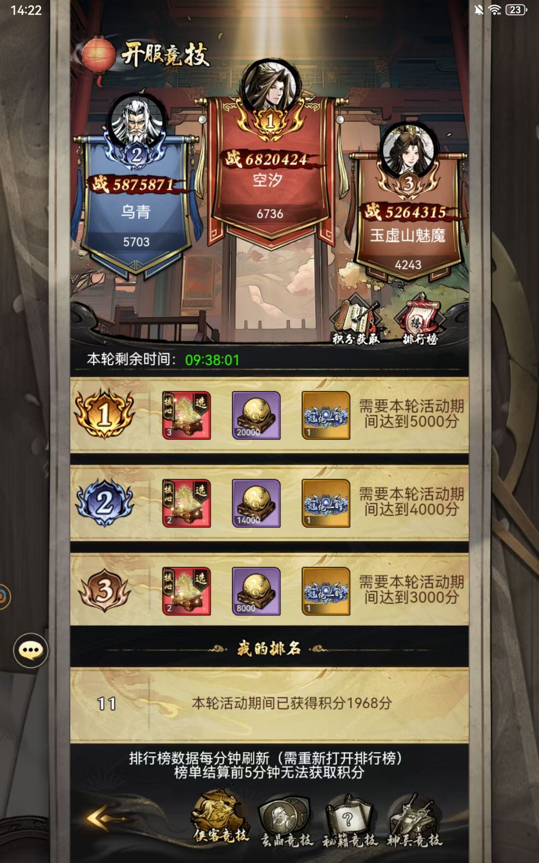 #仗剑封魔 #仗剑周年攻略 “侠客竞技”冲榜攻略 本帖主要是为新手打造,指导如何完成开服冲榜,老玩家可以忽略此贴! 开服第一天为“侠客竞技”冲榜,奖励可以参考图一,此活动持续3天。 积分主要有以下几部分组成: 1、寻英台抽卡 (一抽1分) 2、阵营抽卡 (一抽3分) 3、任意侠客升到8星 (一个100分 只能完成5次) 依此类推侠客升级到11星,13星,15星,16星,17星,18星,19星