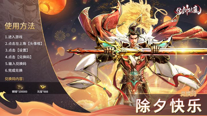除夕快乐!!!岁末的最后一天称为“岁除”,即除夕。在国人心中是具有特殊意义的,这个年尾最重要的日子,漂泊再远的游子也是要赶着回家去和家人团聚。在除夕,辞旧岁迎新春!祝各位神州大陆的涤罪师们龙年大展宏图,时来运转~兑换码:除夕快乐更多资讯请关注:✨仗剑封魔官方①群:694041382✨仗剑封魔小游戏①群:219805221✨仗剑封魔小游戏②群:542520365✨微博:@仗剑封魔MY