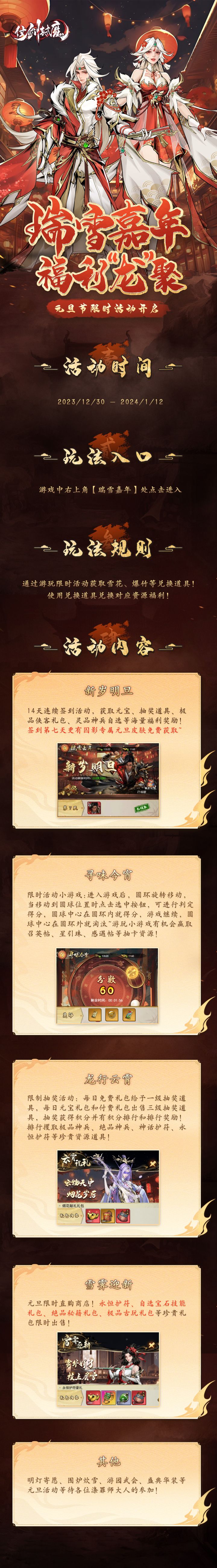 号外号外!各位涤罪师大人,注意啦~神州大陆喜迎元旦节到来!龙年新气象,Q群限时七天送好礼啦~每天砸下一份礼物,请大人每日注意查收哦!【参与方式】加入仗剑封魔官方交流1群:694041382仗剑封魔小游戏交流1群:219805221仗剑封魔小游戏交流2群:542520365每天管理员会在群公告中发放福利兑换码【活动奖励】召英帖、元宝、寻影密函等大量珍贵奖励!【活动时间】2023年1