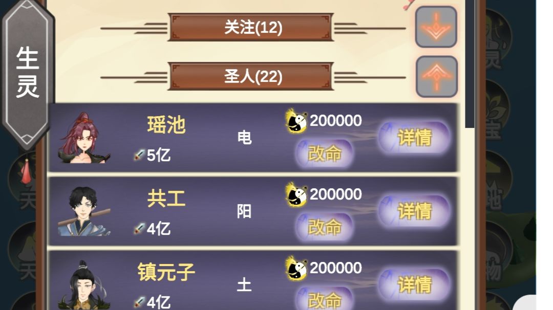 #游戏攻略 1.我先说一个提升战力最快的,搞运气那里,放一个根骨960的人,过几百年,基本都能到准圣,到了准圣可以换别的人,圣人看运气,必须是根骨960的,不然成不了圣人,930的能成准圣,所以根骨很重要! 2.天赐,可以提升根骨悟性,需要消耗本源很赚,根骨说过了,说一下悟性吧,能更快的领悟神通,提升战力,用处还可以。 3.天命,感觉用处不大,种族和势力太多没啥用,种族搞一个就行了,搞多有多的好处