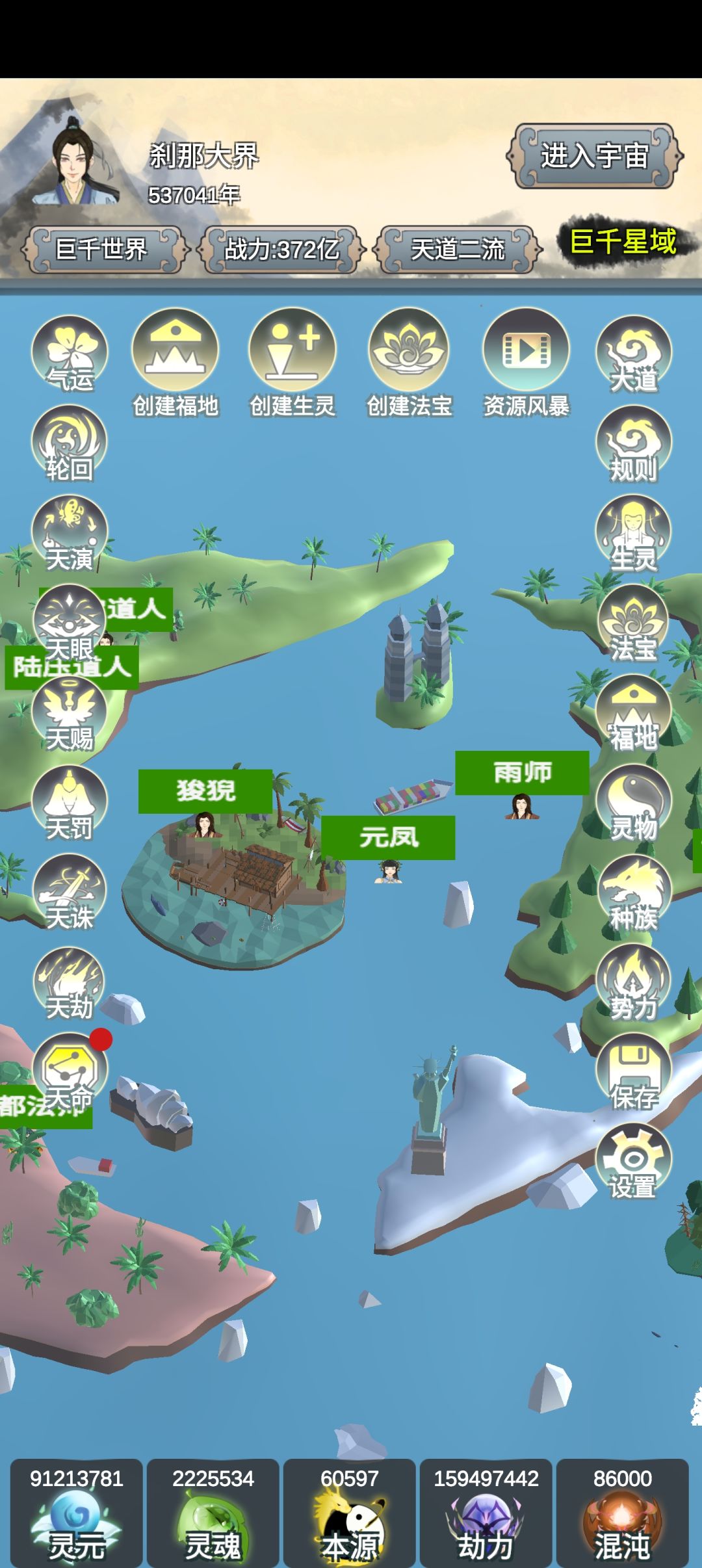 一、等级 天仙 — 灵仙 — 玄仙 — 元仙 — 金仙 — 太乙 — 大罗 — 混元 — 准圣 — 圣人 二、种族、势力、人物境界要求 三、攻略 (一)前期攻略: 1.创建人物,36 个人物弄满为止 2.福地,法宝,弄满。天罚有 bug,消除业力不扣劫力。 福地(+修炼速度,紫霄宫+100%)28 个。法宝有先天至宝(+3KW 战力)8 个, 后期天育可以造 8 个混沌至宝(+1 亿战力) 3.提