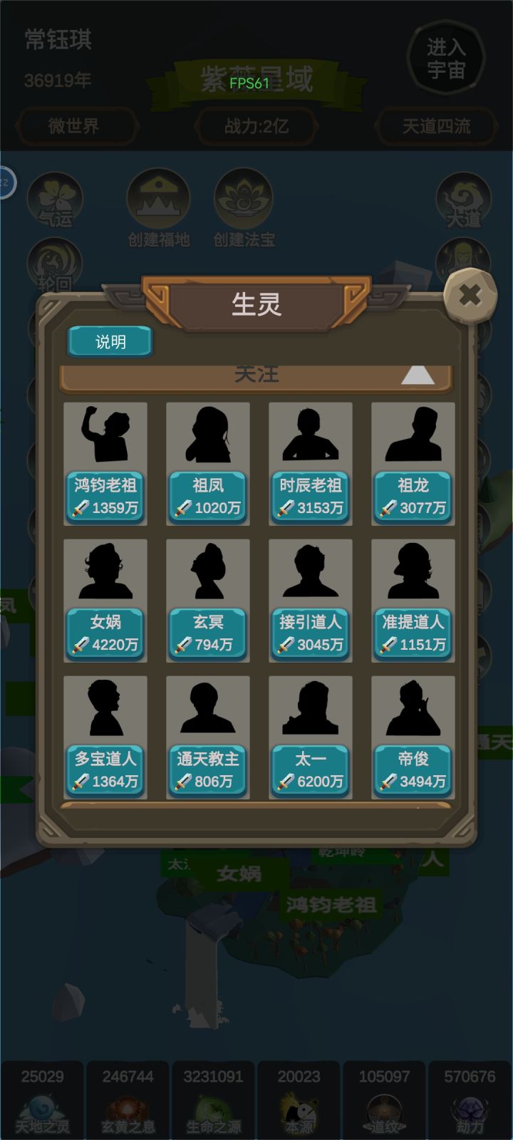 种族创造条件:种族 生灵 等级龙族 祖龙 太乙凤族 祖凤 太乙麟族 始麒麟 太乙人族 女娲 混元妖族 太一 大罗巫族 玄冥 大罗阿修罗族 冥河 太乙势力创建条件:势力 生灵 等级人教 太上老君 混元阐教 元始天尊 混元截教 通天教主 混元西方教 接引道人,准提道人 大罗妖宫 帝俊 大罗巫殿 帝江 大罗天庭 昊天 太乙地府 后土 太乙魔界 罗睺 混元后续版本会
