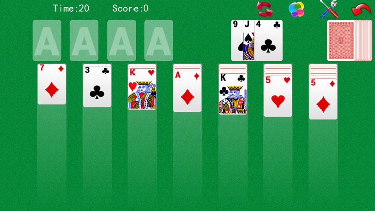 Windows 纸牌只用一副牌玩,共 52 张。游戏开始时使用 28 张牌排成七列。第一列一张牌,第二列两张牌,依此类推。每列的顶牌正面朝上,其余的牌正面朝下。
