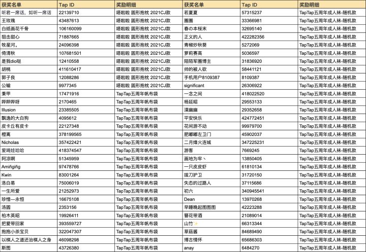 【转发 2021 TapTap 游戏发布会 - 动画预告 抽送看板娘周边】中奖名单出炉啦!恭喜以下10位玩家获得【 Tarara 漫画书一本 】,我们会通过B站私信联系中奖玩家发奖,请留意私信消息,在7月25日23点前回复私信的中奖通知,我们将在收到中奖者信息后 5-10 个工作日内发放奖励。