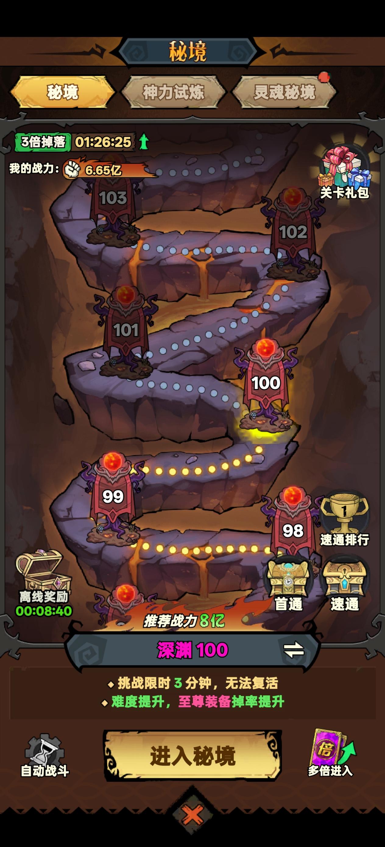 一路秒秒秒,到100层,进去被几个小怪秒了,
