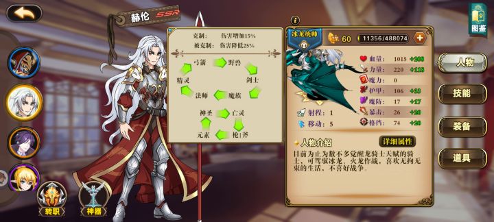 以后比如出个可以转骨龙骑士骑士是魔族那这个整体是属于亡灵与魔族的结合属性 像龙骑是单纯属于枪跟野兽的结合么,有点看不大懂,摩尔是魔族 又是弓箭 那他是不是克制野兽跟法师啥的 希望可以在英雄那里描述出来 还有悬赏问号那里的是描述错误的一天是5次不是6次,可以在体力那里加个多久恢复一个体力值 这样玩家就可以算出大概多久体力会满掉(这个只是建议可有可无反正我体力是不够用的)游戏很好真心喜欢
