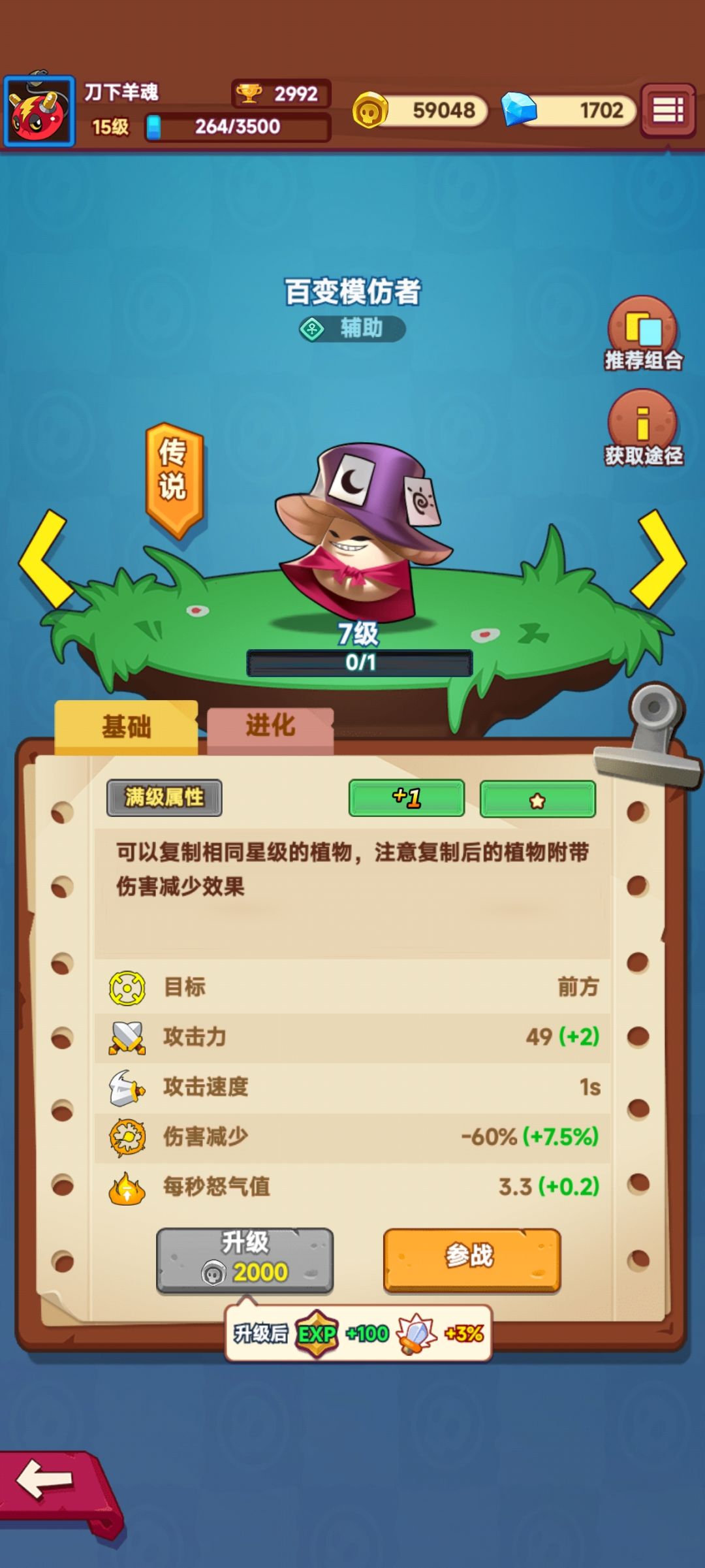百变模仿者在低等级时有着高额的伤害降低的debuff,所以,暂时建议用模仿者复制猴子,等猴子变身后,这个debuff就消除了。或者用模仿者复制水壶,然后给其他植物升星用。